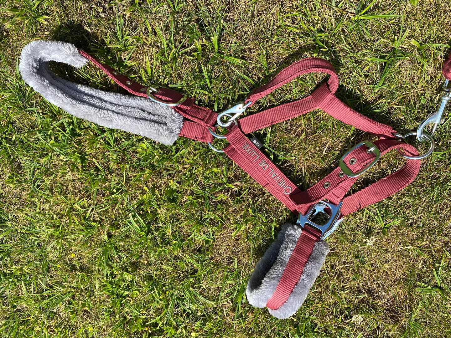 Cheval de Luxe Halter - Hallo, Ik bied een halster aan met een bijpassend touw. Het halster is Bordeauxrood en versierd met grijs pluche, wat het een mooie en luxe uitstraling geeft.