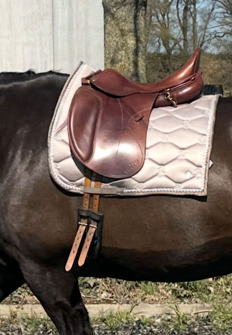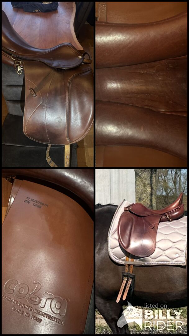 Cobra Pinerolo dressuurzadel 17,5 - Ik bied een Cobra dressuurzadel aan, model Pinerolo met gedupliceerd leer in bruin. Voor brede paarden 17,5 zeer breed en kort Gebruikt op een Haflinger en op een zwaar warmbloed. SW18/28
