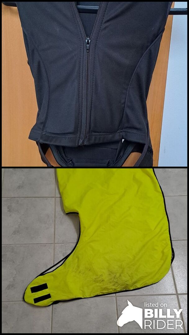 Nier lichte regendeken, zo goed als nieuw, want te kort. Is speciaal gereinigd, vlekken van zadel. Geen gebreken. Maat 135 cm L: rug 72 cm, prijs Fr. 40,--.
