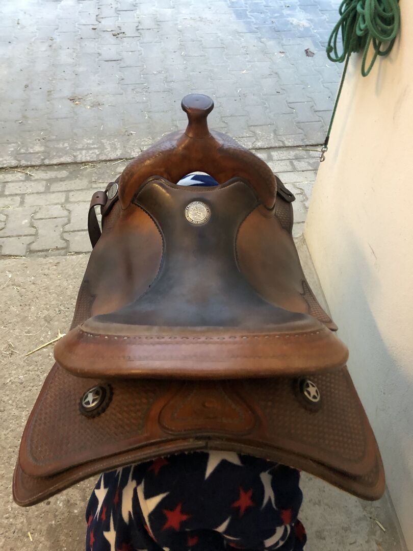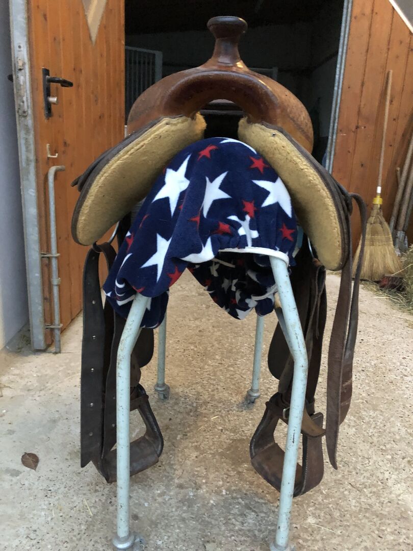 Continental/Pullman Equiflex XFQ Western Zadel - Ik verkoop mijn zeer comfortabele westernzadel omdat het mijn pony niet meer goed past. Het is een Continental /Pullman met XFullQuarter boom met een medium sweep, mooie vrijheid bij de schouders en opent mooi aan de achterkant, zodat het ook goed past op de ronde geribde paardenmodellen. Hij heeft een 16 zit, omgeslagen spatborden en brede stijgbeugels. Ik heb geprobeerd het ongeveer op te meten... Zie foto's. Hij is altijd droog en overdekt opgeslagen geweest.
