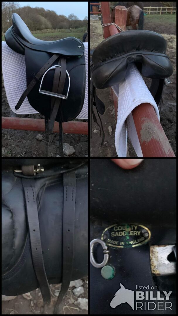 Country Saddlery 16" black leather saddle. In pretty good condition, some stitching gone but leather is good and tree is good. All proceeds will go to a horse sanctuary.