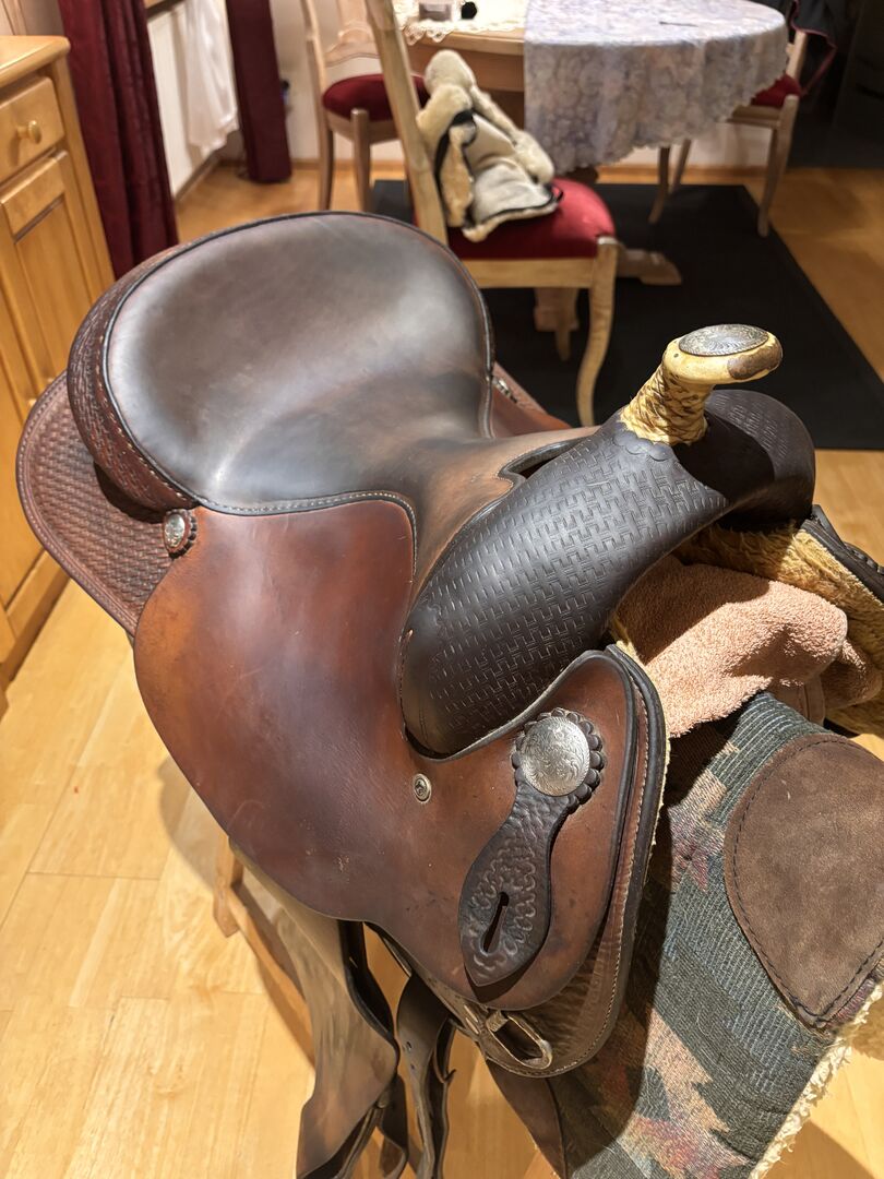 Een super comfortabel westernzadel van het merk "Crates" dat niet vaak gebruikt wordt. Omdat mijn man en zijn paard met pensioen gaan, is het zadel te koop. Het heeft nauwelijks gebruikssporen op de spatborden na. De latigo is ook nog goed. De stijgbeugels zijn niet inbegrepen. Het zadel heeft een hoorn van rawhide. De zadelmaat is 16". Het is handgemaakt en de prijs was €2.650. Ik ontvang graag realistische prijssuggesties.