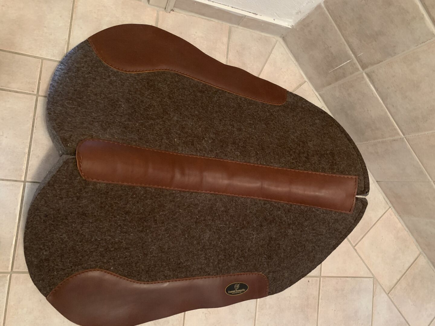 - 100% volvilt gemaakt van schapenwol zonder synthetische vezels - 1 inch dik (ca. 2,5 cm) - ergonomisch gevormd, ruggengraatkanaal - zeer zweetabsorberend - natuurlijke dempende eigenschappen - mat vormt zich naar de rug van het paard - lederen bekleding aan beide zijden, schoft en wervelkanaal - geolied leer - gemakkelijk te reinigen door borstelen - Afmeting: ca. 76 cm x 76 cm - Een uitstekende onderlegger voor dagelijks gebruik