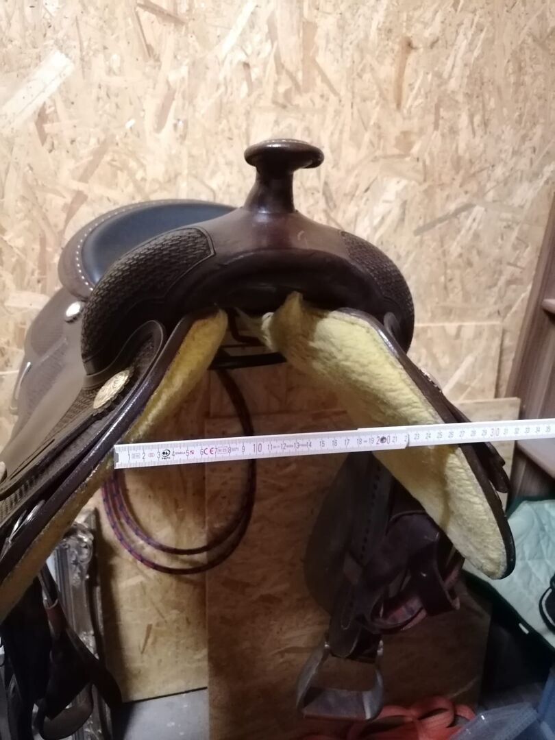Cully's Pure Westernzadel (Triple W Platinum) - als nieuw - Ik verkoop mijn donkerbruine reiner westernzadel van Cully's Saddlery - een Triple W Platinum. Het is in topconditie (als nieuw) omdat het maar een paar maanden gebruikt is omdat mijn paard helaas aan koliek is overleden kort nadat ik het gekocht had. Daarom wordt het zadel nu verkocht. Het zadel is altijd droog en beschermd opgeslagen geweest. Het zadel is gemaakt van glad zwart leer. Het nummer onder de riemhouder is M899. De afmetingen van het zadel zijn te zien op de foto's. Als je meer afmetingen of foto's nodig hebt, stuur ik ze je graag toe.