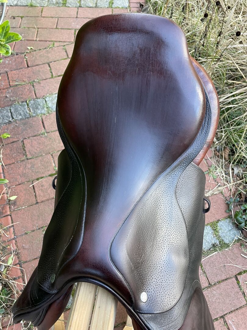 CWD-zadel S02 - We verkopen dit geweldige springzadel van het merk CWD omdat het helaas niet op onze pony past. Het heeft een zitmaat 17 en de kamerbreedte zou moeten overeenkomen met een 32 voor Prestige. De conditie is gebruikt, maar in principe goed. Zoals je op de foto's kunt zien, zijn de panelen een beetje gevlekt.