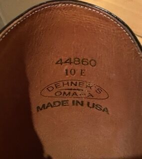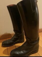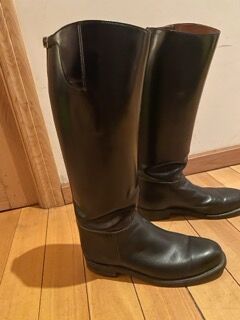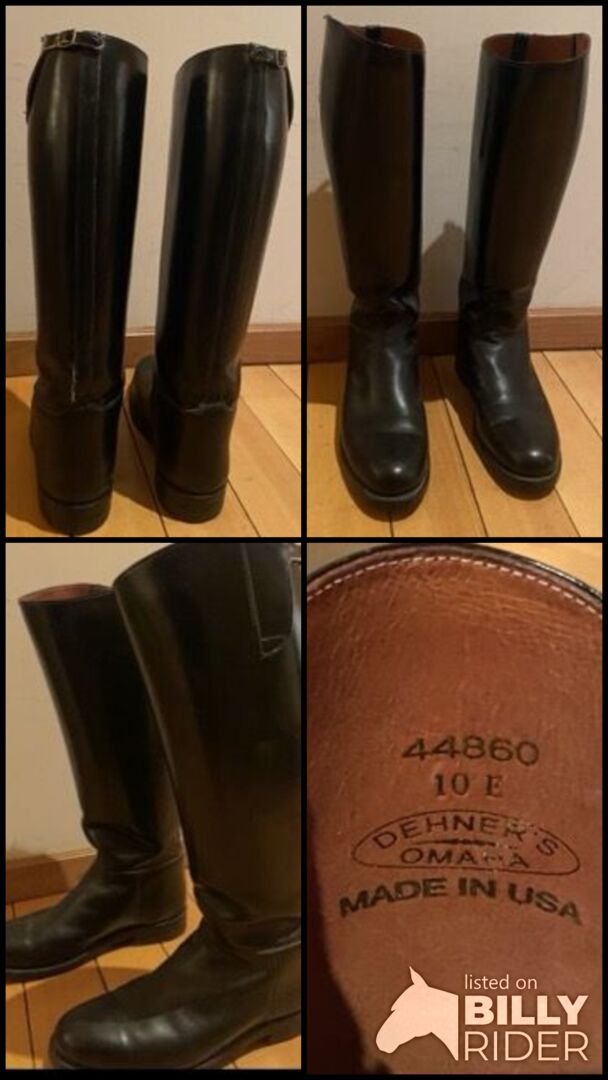 Dehner DOMA Klassieke Dressuur Laarzen US10E Wide Fit EU43 Handgemaakt USA - Repareerbaar - Traditionele professionele pull-on rijlaarzen van sterk, hoogwaardig leer, bekend om hun duurzaamheid en elegante rechte schachtontwerp. Zeer gewaardeerd door klassieke dressuurruiters. Merk: Dehner Boot Company (VS) Model: DOMA Kleur: Zwart leer. Maat: US 10E (Wide Fit) - ongeveer EU 43. Afmetingen (ongeveer): - Schachthoogte: 48 cm (gemeten van vloer tot bovenkant - zie foto). - Kuitomtrek: 40 cm. Traditioneel trekkervormig ontwerp (geen ritssluiting). Het leer blijft sterk en soepel en de schachten blijven recht en structureel stevig. Staat: Goede gebruikte staat overall. Let op: De linker laars heeft een leersplit langs de naad (zie detailfoto). Te repareren door een professionele schoenmaker en dienovereenkomstig geprijsd. Geschikt voor dressuur, klassieke paardensport of ceremonieel of historisch rijden. Verzending binnen Europa beschikbaar. Plaats: Spanje. Prijs: 349 € - open voor redelijke aanbiedingen. Inclusief laarzenspanners, kuitbomen om vorm te behouden. Controleer de maten zorgvuldig voordat u tot aankoop overgaat, want de pasvorm kan per ruiter verschillen.