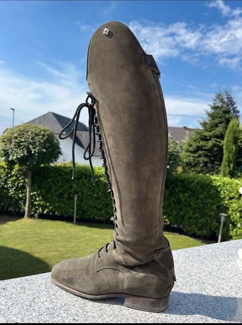 DeNiro rijlaarzen 38,5 MA M - Ik verkoop deze prachtige, zeer speciale De Niro dressuurlaarzen van suèdeleer in groen, rits aan de achterkant, vetersluiting, zelfklevend leer aan de binnenkant,