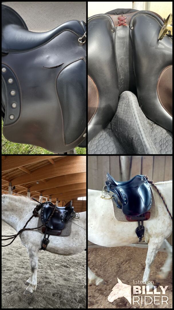 Deuber El Campo S2 met accessoires - Ik verkoop mijn Deuber El Campo S2. Het zadel is in goede staat, goed onderhouden, vers bekleed zonder schade door vallen of iets dergelijks - alleen kleine maar gebruikelijke tekenen van slijtage. Regelmatig gecontroleerd door de zadelmaker. Stijgbeugelriemen van FA. Stübben en de "Mariahilf" zijn inbegrepen. Het zadel lag op mijn Lipizzaner, die nu een zeer rechte rug met weinig schommel heeft ontwikkeld. De kamer is momenteel wijd ingesteld. Maar, zoals gebruikelijk bij D & P, kan dit heel gemakkelijk worden aangepast door de zadelmaker met behulp van een impus. Als je het zelf wilt doen, kun je de breedte ook zelf aanpassen. -- Incl. nieuw Christlammfell zadeldek El Campo en de monostijgbeugels maat M Deuber FP: 1950 € --.