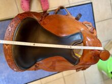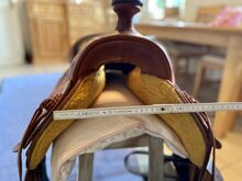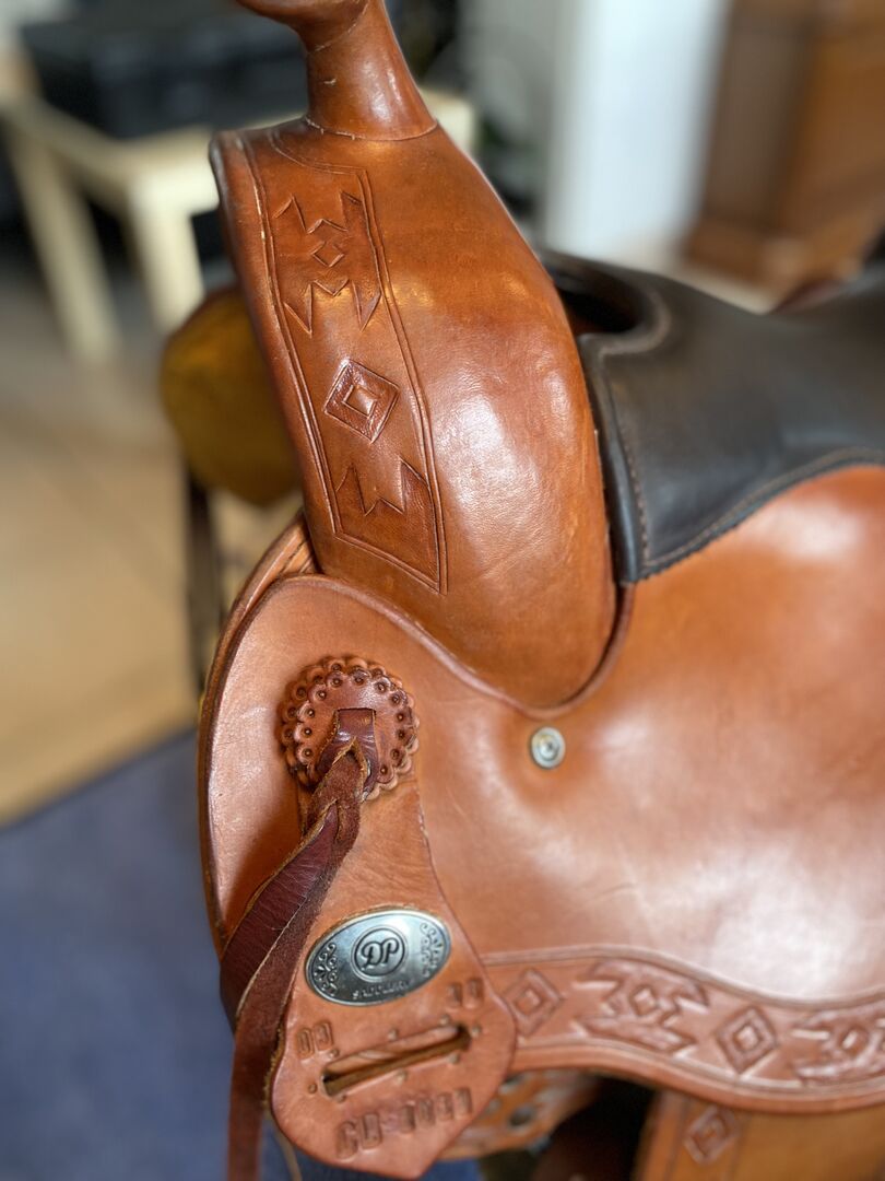 Deuber en Partner westernzadel RARITY - Ik bied hier een goed onderhouden Trail Rider aan. De zadels met dit patroon zijn zeldzaam, vooral in deze staat. Het zadel is een bewezen klassieker en combineert comfort, lichtheid en functionaliteit. De lichtgewicht constructie, de praktische ronde rok, die vooral gunstig is voor KORTE paarden, en het hoge comfort maken dit westernzadel tot een echte allrounder. Houten boom Zadelmaat 16 Zadelleer naturel Zadelleer zwart Stootrand S Leder hoorn Stijgbeugel runderhuid Gewicht 12 KG Roklengte ca. 62 cm, Rok diepte ca. 31 cm PS lichte kras aan de rechterkant, op de foto te zien als iets donkerder vlek omdat ik er wax op heb gedaan. Helaas gebeurd tijdens het transport vandaag. Het is niet diep, ik maak er foto's van op verzoek.