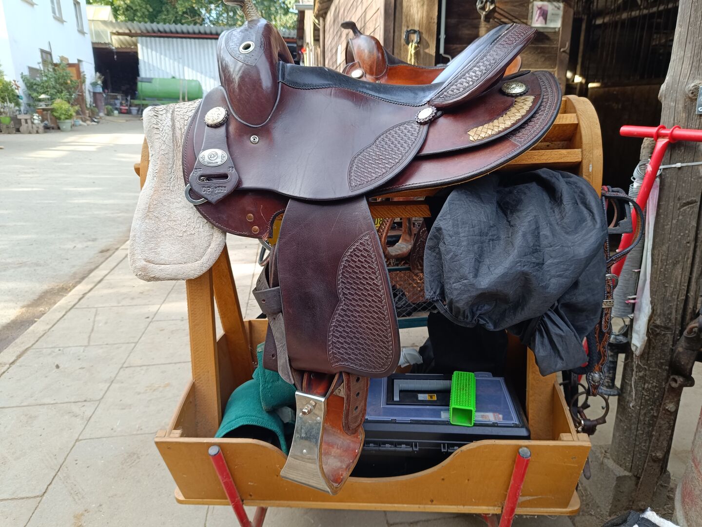 Tuigage voor: C-Ring Inskirt op 7/8 positie Tuigage achter: - Beslag: Zilveren conchas Stempelmerk: Bordertooling Hoorn: Ruwhuiden hoorn met zilveren concho Stijgbeugels: Ruwhuiden stijgbeugels Gewicht: ca. 13,5 kg Lengte rok: ca. 64,5 cm Diepte rok: ca. 30 cm Speciale kenmerken: Classic Line Pro, rawhide vlechtwerk op de rug jockey