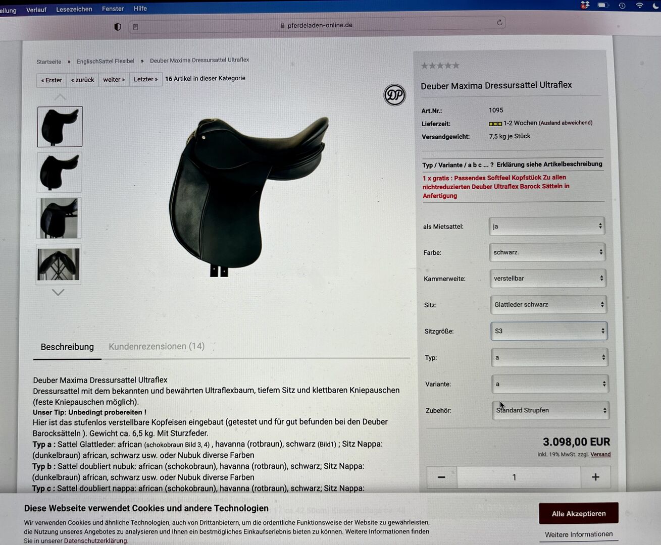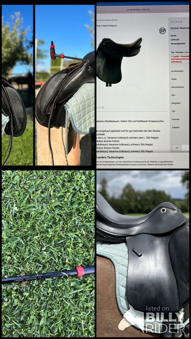 Deuber Maxima Ultraflex S3, kamer traploos - Verkoop prachtig Deuber Maxima dressuurzadel, S3 = 18". Traploos verstelbare slokdarmbreedte! Goede inbussleutel met kogeleinde wordt meegeleverd. Verstelmechanisme werkt perfect. Flexibele Ultraflex zadelboom.