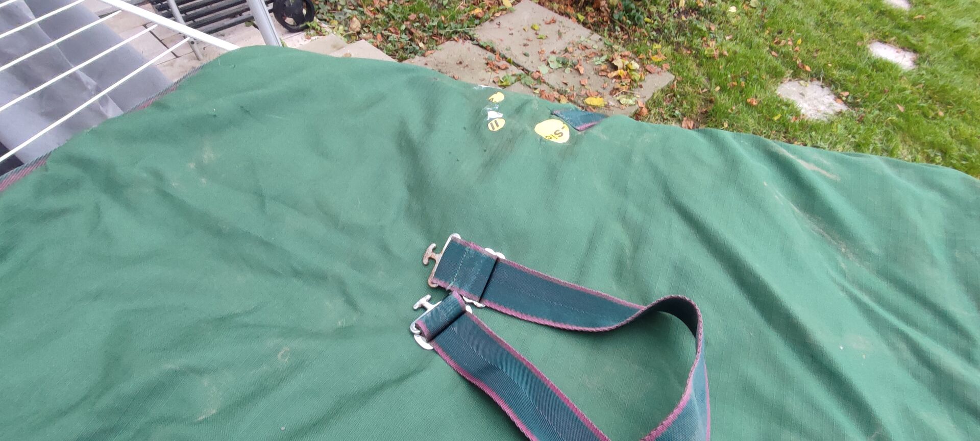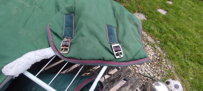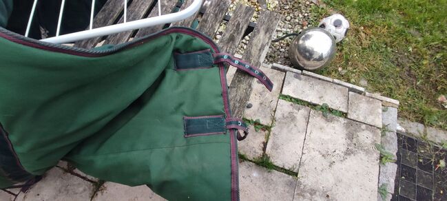 Ik verkoop een dikker staldeken met beenkoorden. Volgens het label op het deken zou het maat 125 cm moeten zijn. Ik heb het ook nog een keer opgemeten met een duimstok en de lengte was 127 cm.