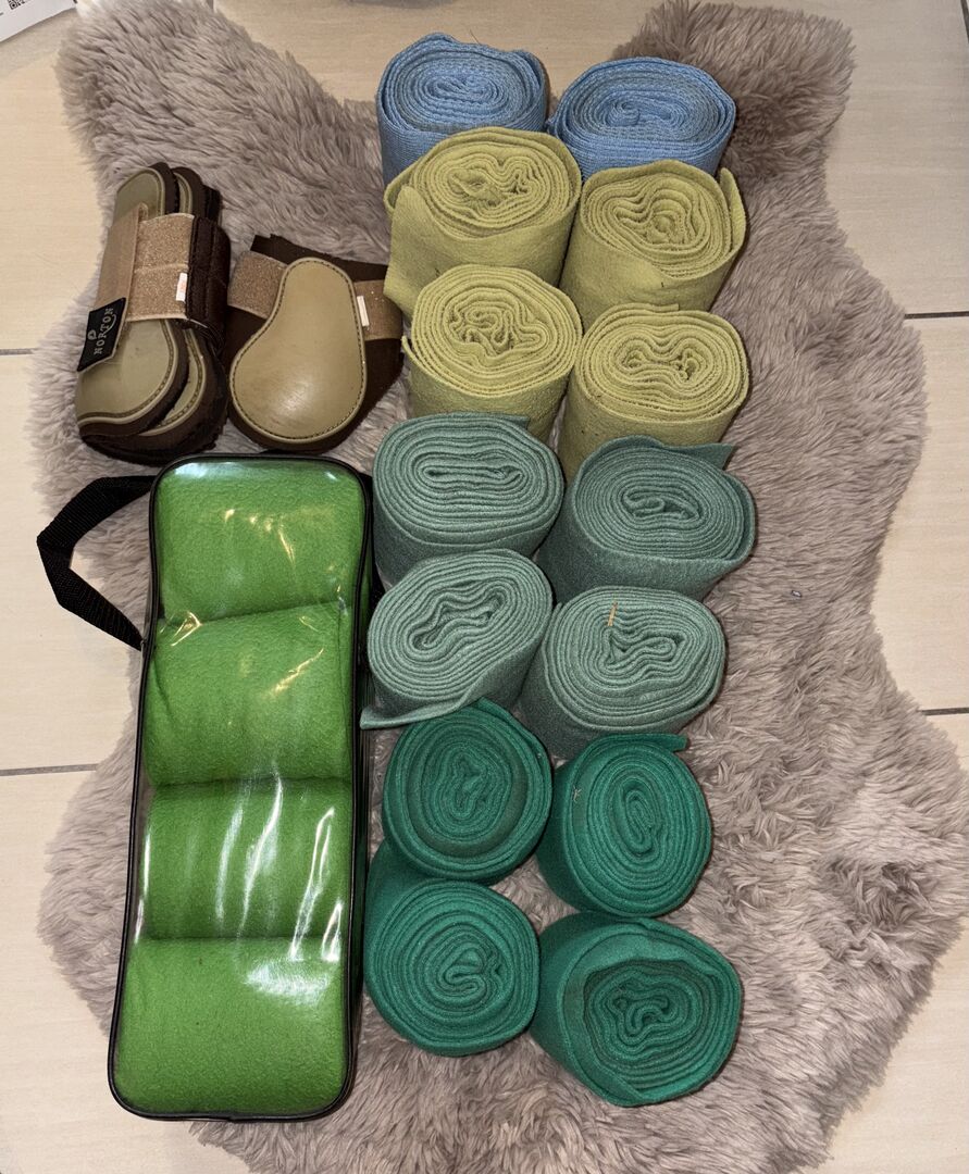 Te koop in deze set zijn: - Verband donkergroen set van 4 - Bandages sterk groen set van 4 met tas - Verbandmiddelen grijsgroen set van 4 - Bandages lichtgroen/geel set van 4 - Ziek/ontlast bandages blauw set van 2 - Regenlaarzen + Fetlock laarzen Norton Pony