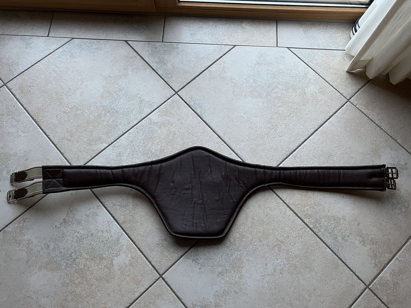 DMS Studded singel 135cm bruin Zadelriem met elastiek aan één kant - Ik verkoop een bruine noppensingel van DMS. De singel is 135 cm lang en is zelden gebruikt, dus in goede staat. Eén gesp aan de niet-elastische kant is een beetje versleten, maar dat zie je ook op de foto's. Het rubber van de elastische inzet is niet versleten. Het heeft zelfs nog het originele prijskaartje 149,00€.