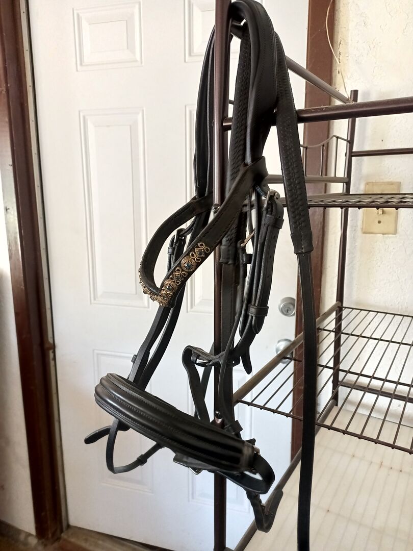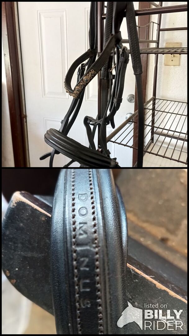 New tried on only Dominus bridle. Browband is not new, 1 stone missing. Matching rubber reins.