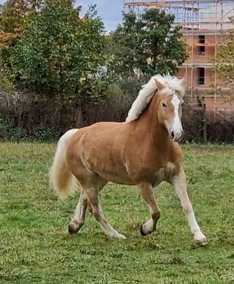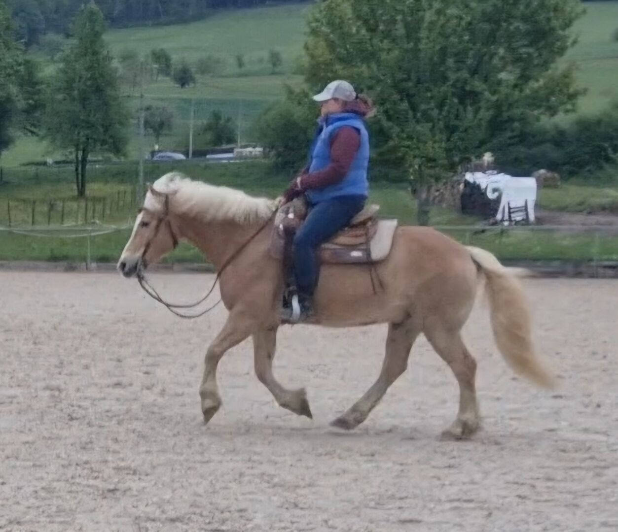 Dream Haflinger ruin - Nottings Nepomuk alias Muki is een echte allrounder. Ik heb hem zowel western als dressuur gereden. Hij kent ook een paar trucjes op de grond, dubbele longe, lange teugels, cross-country, vrijspringen en vrij werk. Muki is erg onbevreesd. Als hij iets eng vindt, kan hij snel worden aangemoedigd om er naar te kijken door hem te kalmeren en te aaien. Muki heeft nog nooit gebokt of iets anders slechts gedaan tijdens het rijden. Hij is altijd aan de hulpen, zelfs in een onbekende omgeving. Muki is bekend met open stallen, box- en paddockcombinaties en paddockboxen. In ieder geval heeft hij zijn maatjes nodig. Hij gaat zonder problemen alleen en in een groep naar buiten. Hij is ook geweldig in het pistewerk.
