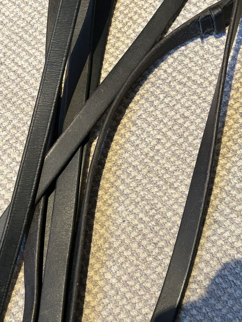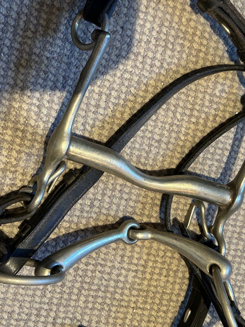 Dressuur handvat bit compleet 13,5 - Mooie kwaliteit, maar al wat ouder. Ik heb het al een tijdje in mijn kast staan, maar helaas gebruik ik het niet meer. De kalebassen hebben een breedte van 13,5 cm. Compleet aangeboden: hoofdstel, bitten, kinketting, drie paar teugels. Leer, zwart