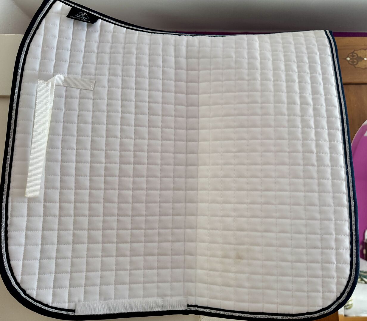 Dressuur Show Zadeldekje Vol - Mooi en zeer groot zadeldek. Met donkerblauwe en zilveren rand. Nieuw en ongebruikt. Helaas een klein vlekje (zie foto) dat er met wassen zeker uit zal gaan.