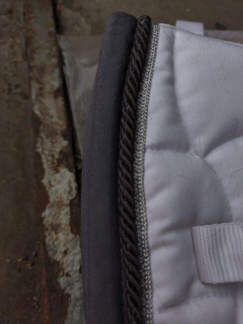 Dressuur zadeldek van Esperado - Mooi wedstrijdzadeldek DL van Esperado, wit met grijze rand en zilverkleurig koord. Zadel is een beetje afgeschuurd, maar verder geen vlekken of slijtage.