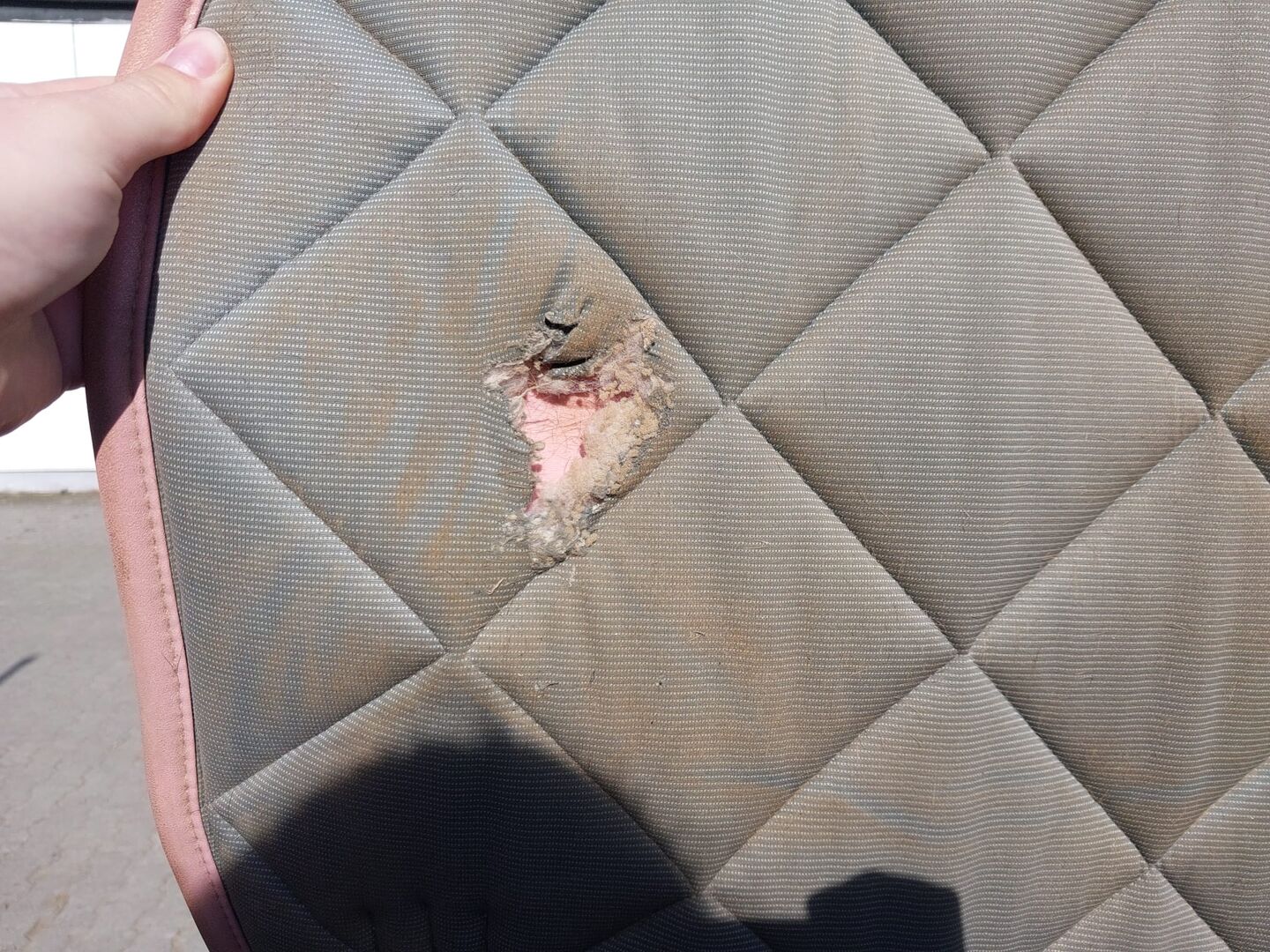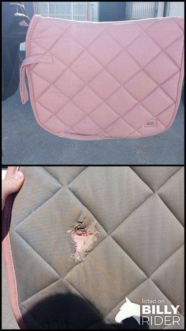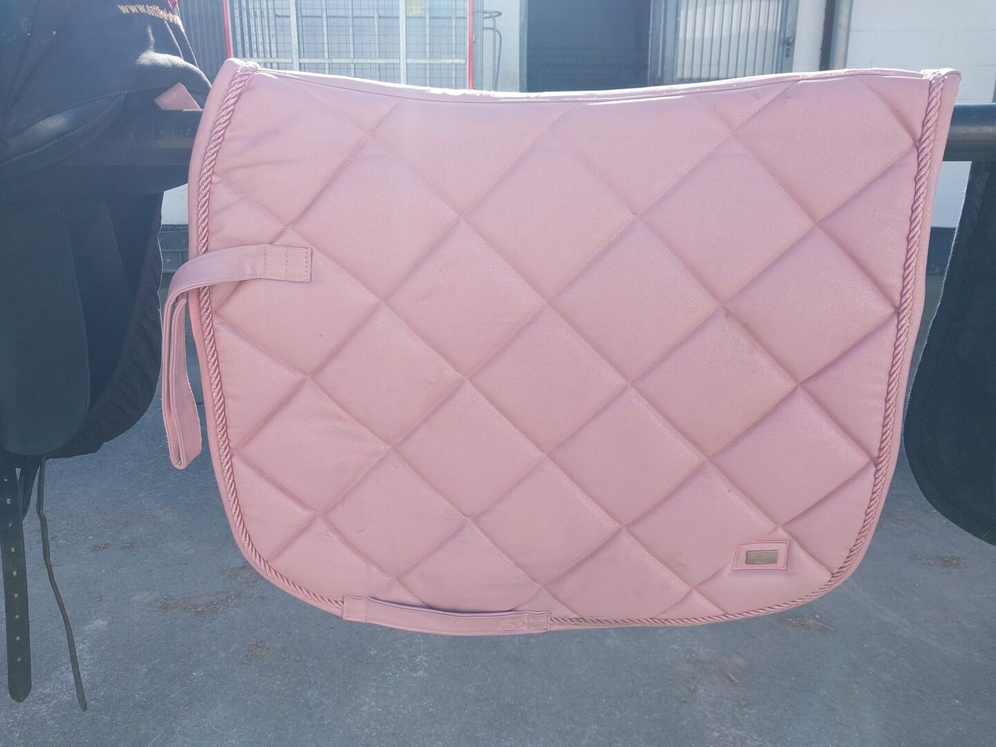 Dressuur zadeldekje - Dressuurzadeldek roze met glitters, klein gaatje aan de binnenkant door een muis, verder goede staat