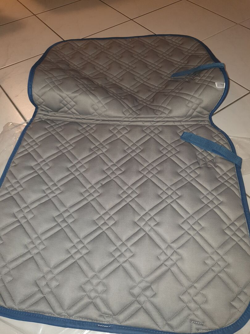 Ik bied een nieuw dressuurzadel te koop aan. De kleur is maanlichtblauw. De rand is dezelfde kleur. Het zadeldek is versierd met een discreet lichtgrijs koord en de stof is mooi gewatteerd.