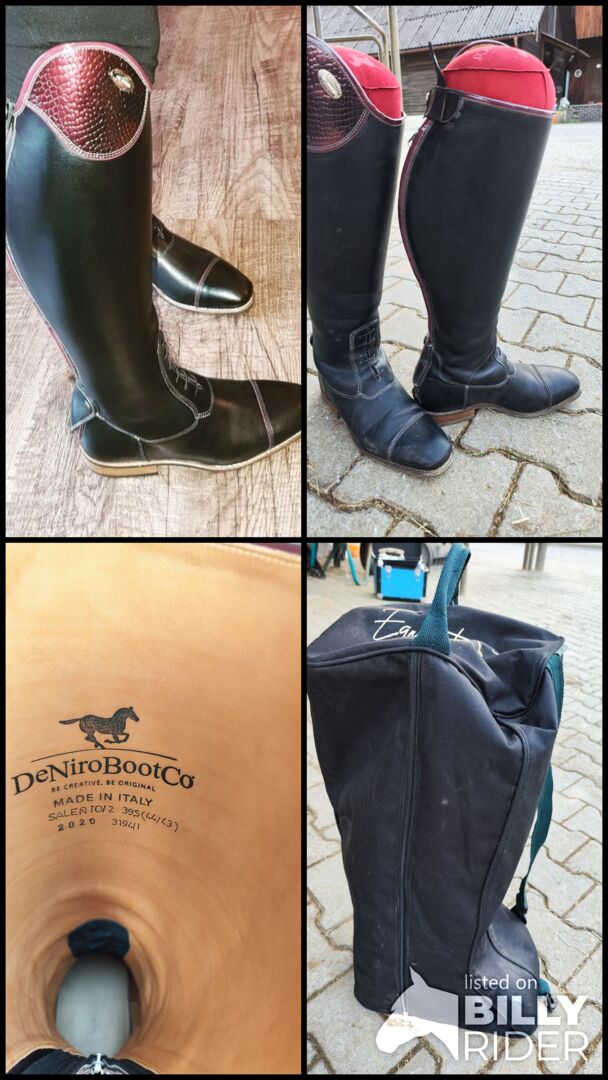 Dressuurlaarzen - Nauwelijks gedragen DeNiro laarzen in geweldige kleur met contrasterende stiksels en zool. De laarzen zijn niet vaak gedragen omdat ik ben overgestapt op westerns. De laarzen werden op bestelling gemaakt. Neem de maten over van de foto. Voor brede kuiten en korte benen. Kleur zwart mat met bordeaux decoratie. Nieuwe prijs 670€
