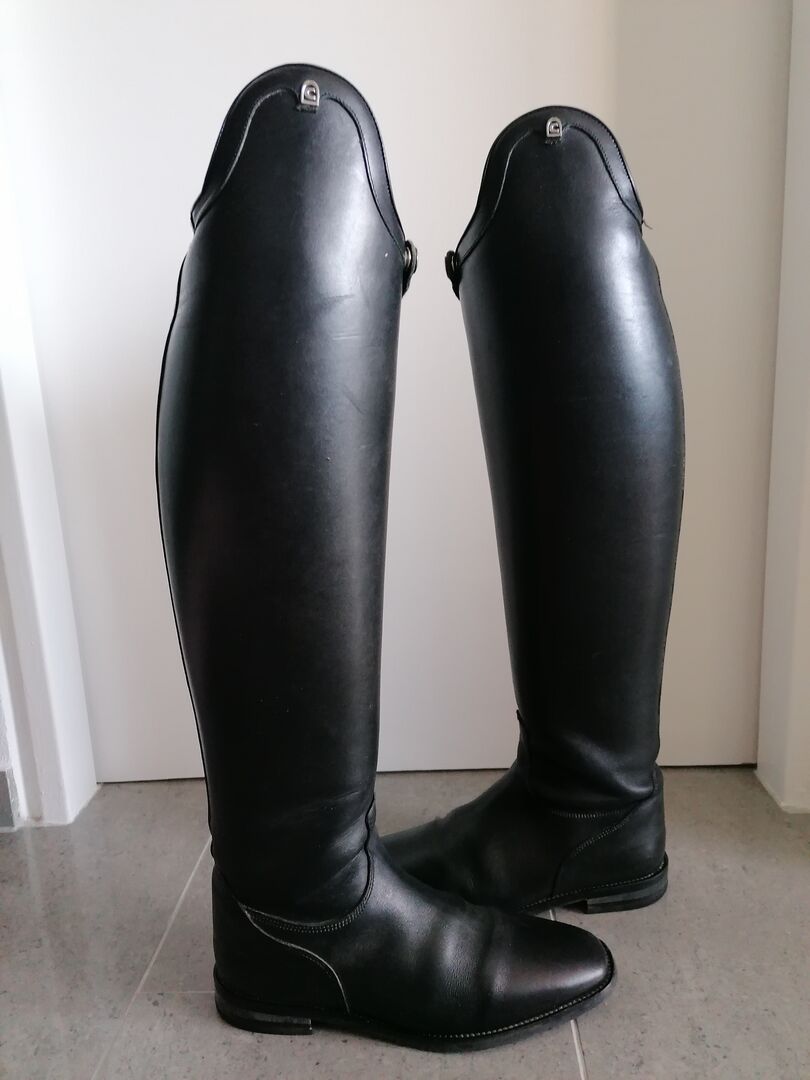 Hierbij verkoop ik mijn Cavallo Insignis dressuur rijlaarzen. Ik kocht ze in maart 2017 voor 500€ en heb ze slechts twee zomers gedragen omdat ik in 2018 een knieoperatie onderging. Helaas komen de laarzen precies op mijn operatie littekens terecht, daarom wil ik ze nu weggeven. Ik heb de laarzen regelmatig verzorgd en ze altijd in een laarzentas met laarzenspanners bewaard. Gedurende de winter en sinds mijn operatie heb ik de laarzen thuis gehouden. Ze vertonen lichte tekenen van slijtage, maar zijn verder in zeer goede staat. De ritssluiting van de linkerlaars werd vervangen door een schoenmaker omdat er folie in was blijven steken en de rits niet meer dichtging.