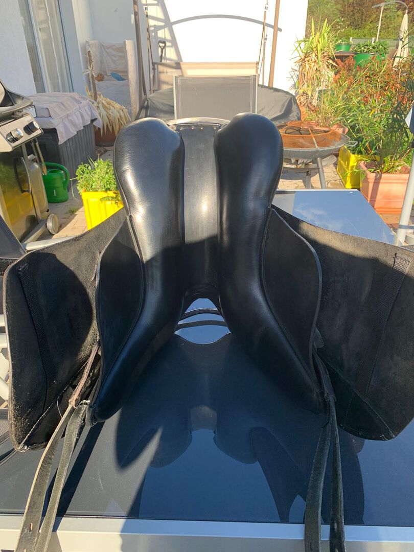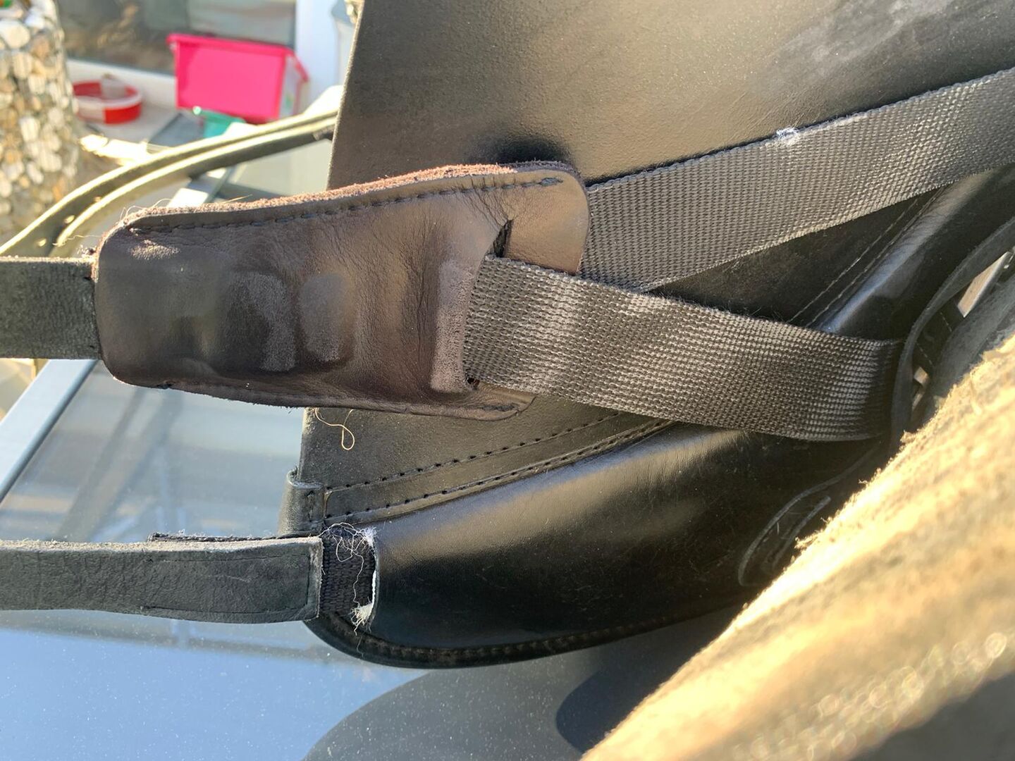 Zitting 16 inch Totale lengte ca. 45 cm slokdarm breedte 24 cm Stijgbeugelriemen van Passier in 160 cm lengte Stijgbeugels van Stübben Breed wervelkanaal Strips zijn allemaal in tact Het zadel kan veranderd worden bij de zadelmaker. De zadelbeschermer wordt samen met het zadel verkocht