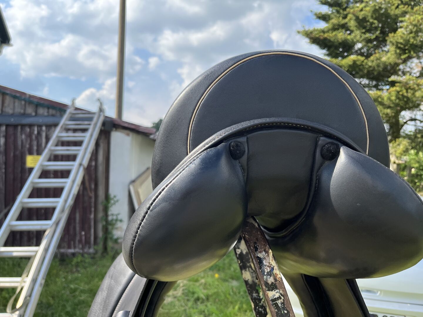 Dressuurzadel 17,5 - Dressuurzadel in nieuwstaat in 17,5 Zwart leer en crème bies Goed geschikt voor volumineuze paarden met normale hoge schoft Vrij diepe zit en zacht opgevuld NP 1800€ Verzenden of afhalen mogelijk Uitproberen van het zadel mogelijk tegen achterlating van de aankoopprijs (ophalen of verzenden)