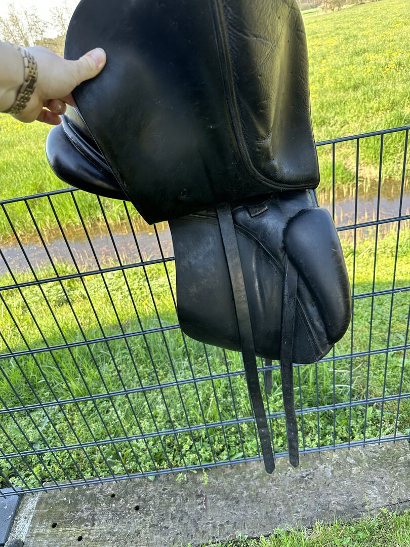 Dressuurzadel 17,5 inch - Ik bied een dressuurzadel aan dat ik graag gebruik. Dit is een zadel op maat. Er zijn gebruikssporen zichtbaar, maar het kan nog steeds zonder problemen gebruikt worden.