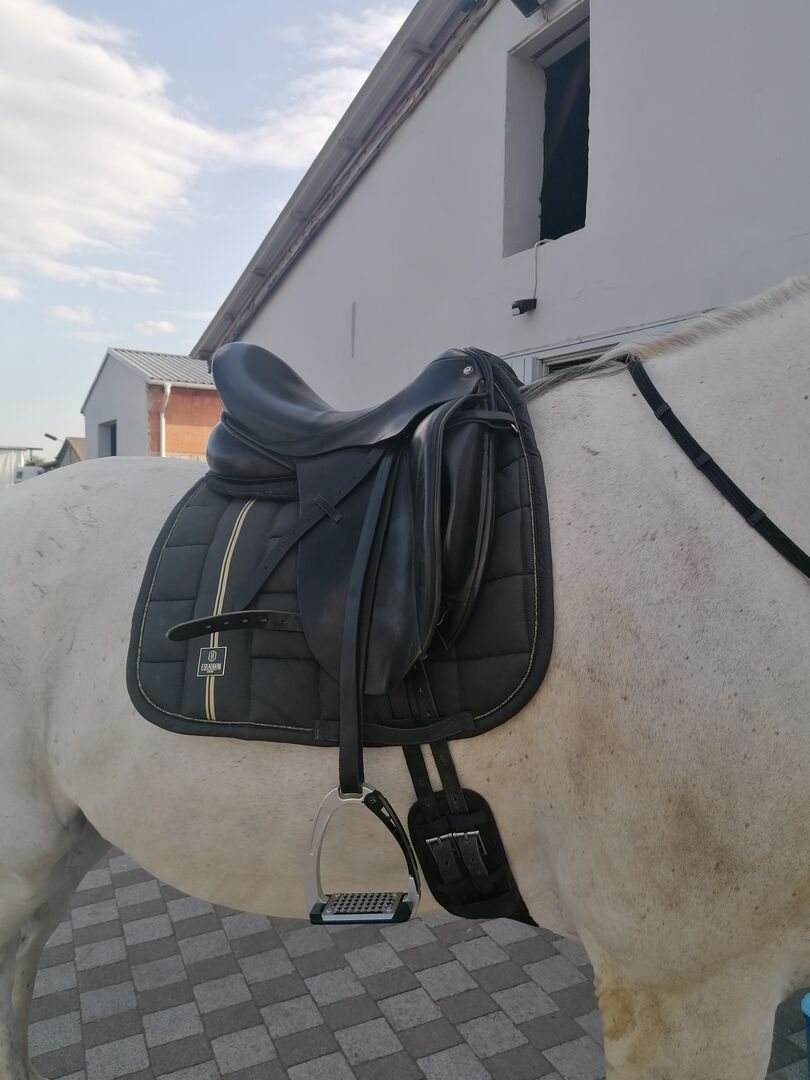 Dressuurzadel - Ik verkoop een 18 inch dressuurzadel, afmetingen volgens de foto's. Het is een deluxe zadel van het Engelse merk. Het zadel lag op een grote Hannoveraan met veel schoft. Ik heb het zadel ongeveer 2 jaar geleden tweedehands gekocht bij een zadelmaker, het is niet veel gebruikt omdat ons paard niet veel gereden werd vanwege ziekte. Het leer is erg zacht. Het zadel is in een goede en verzorgde staat. De grote knierollen zorgen voor een goede pasvorm in het zadel.