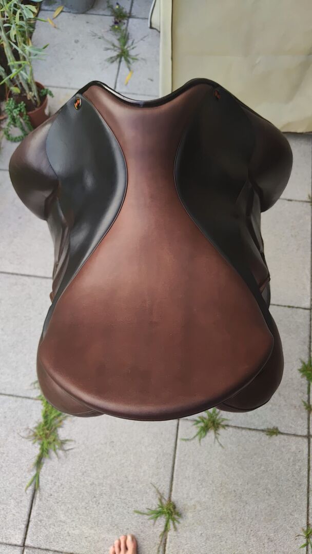Dressuurzadel - Comfortabele zitting Lage zitting, bilspleet Schuiminzet in het blad met professionele afwerking Strass steentjes in de halve maan Heeft een compleet nieuwe bekleding gekregen.
