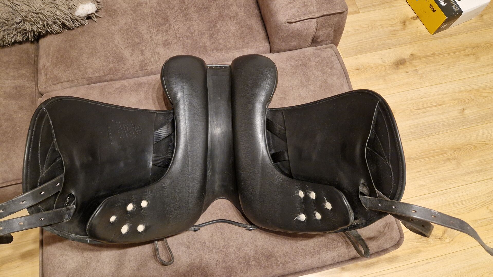 Dressuurzadel Albion Fabrento 18inch - Ik verkoop mijn dressuurzadel van Albion Fabrento in zitmaat 18. Ik heb het zadel 3,5 jaar geleden gekocht met mijn merrie maar voel me er totaal niet comfortabel in door de dikke knierollen. Het is altijd goed verzorgd geweest. Het zadel heeft een klein scheurtje op de linker zadelklep (zie foto's).