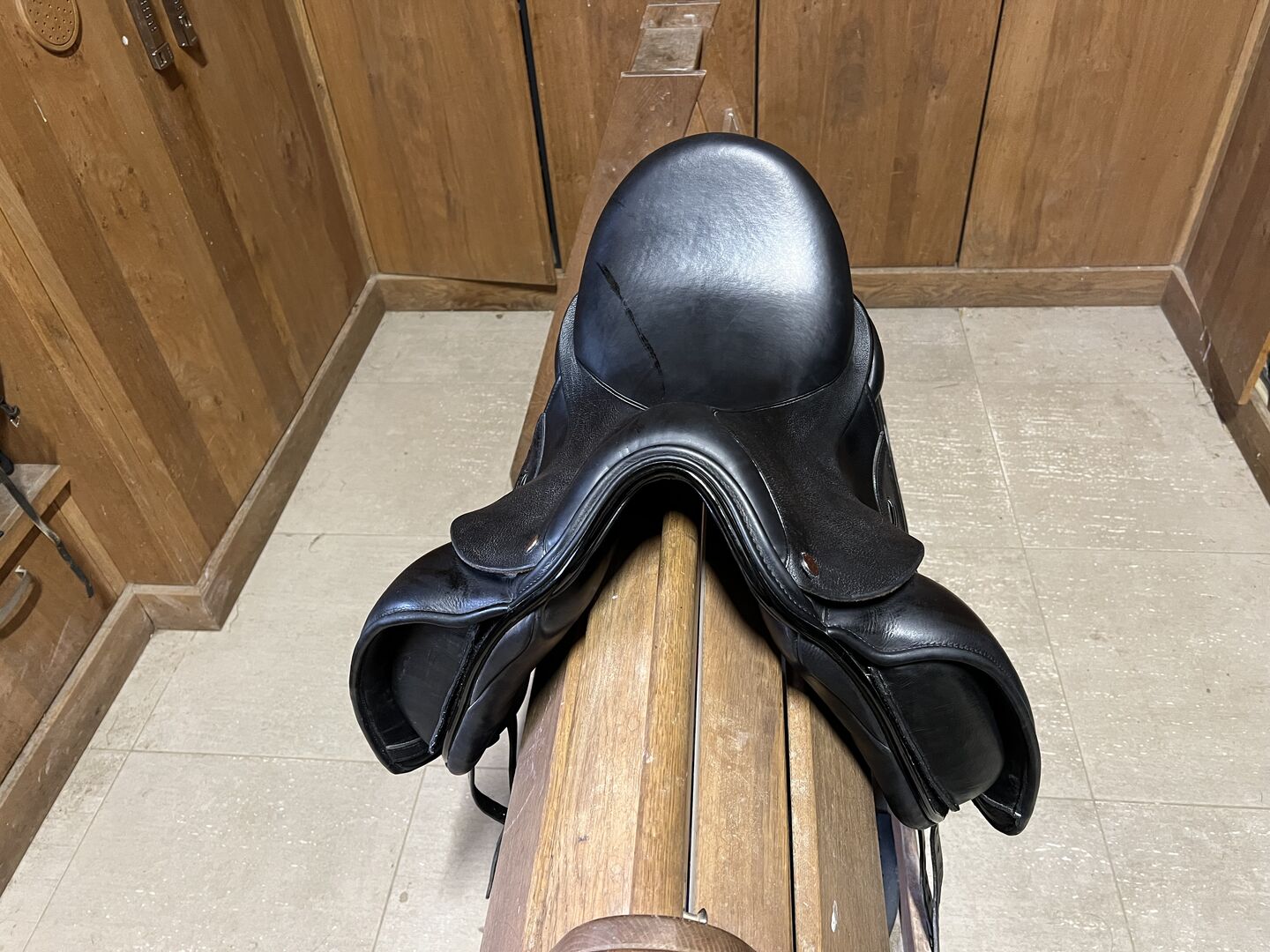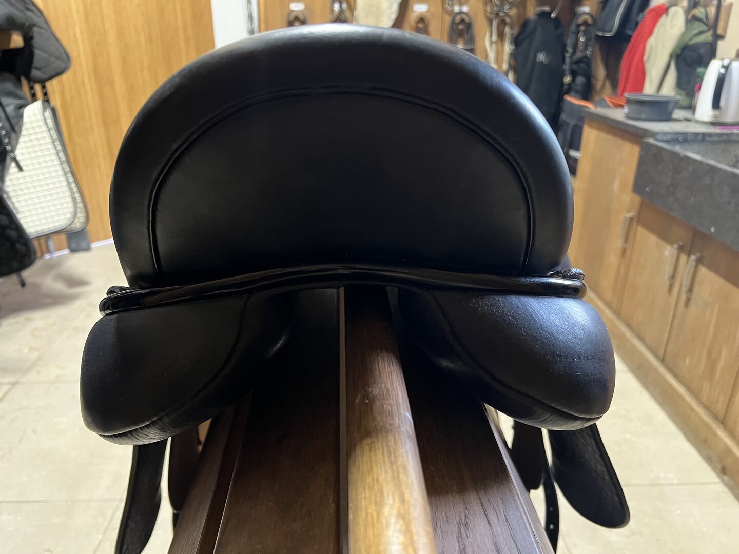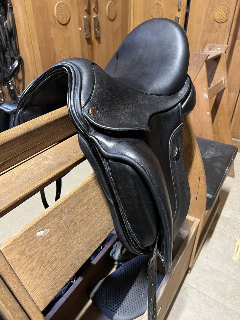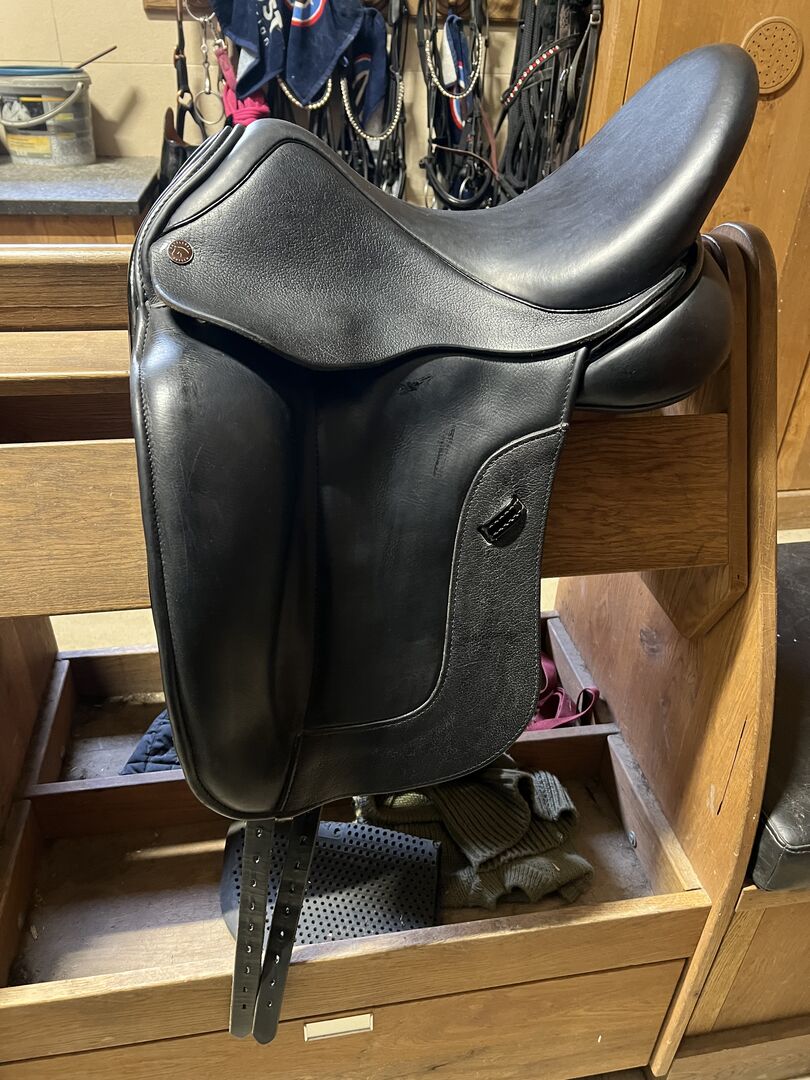 Dressuurzadel Dresch - Standaard klep, bies en gewrichten van lakleer (zwart), kleppen van buffelleer, geschikt voor korte tot middellange paardenruggen, gemiddelde kamerbreedte Het zadel is zo goed als nieuw door blessure (1 maand in gebruik sinds aankoop) Ruiter had een ander zadel omdat de zitting te klein was. Het zadel kan op maat gemaakt worden door zadelmakerij Dresch, factuur beschikbaar!