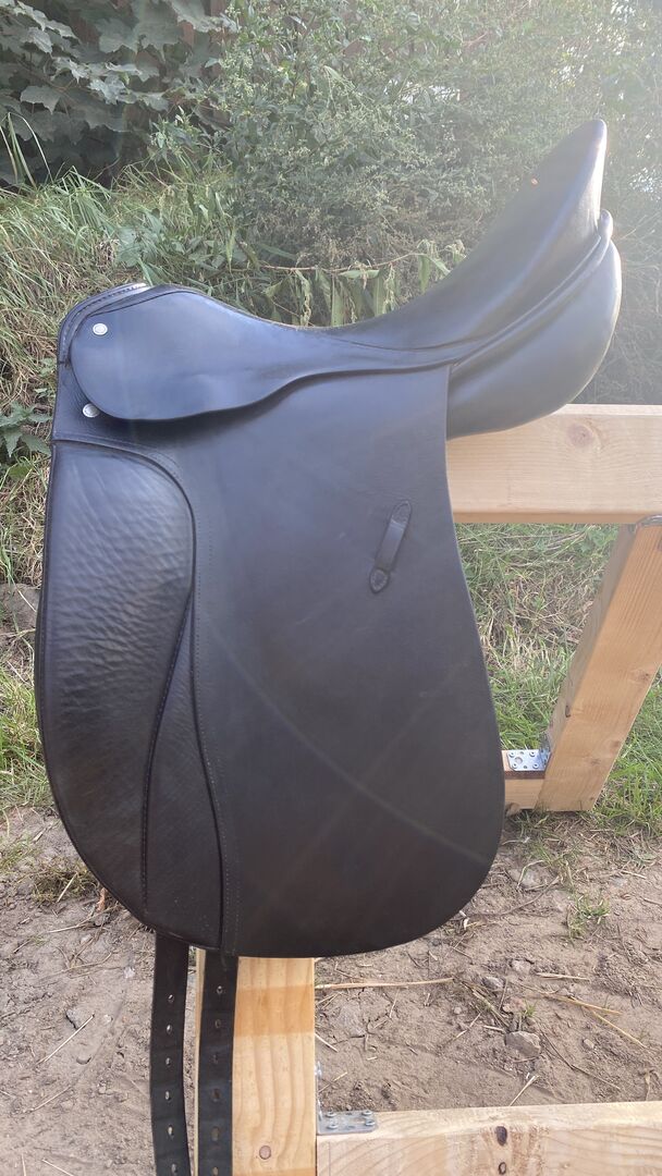 Het is gekocht in oktober 2024 en opnieuw bekleed door mijn zadelmaker. Het lag op een grote Oldenburgermerrie met een korte rug.