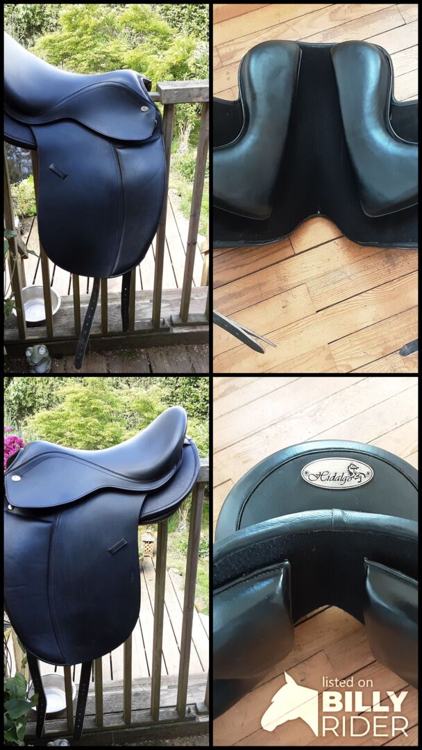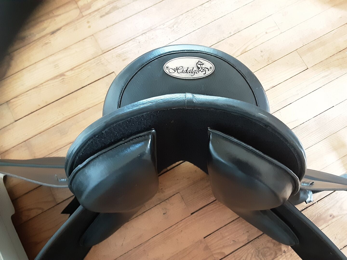 Dressuurzadel Hidalgo Venice, Lederboom kort, breed paarden - Gekocht in het voorjaar van 2022 Niet meer dan 30 keer op het paard geweest Incl.Grandeur zadeldek en Hidalgo lederen singel In zeer goede staat Klittenband 43 cm Gebruikt op een sterk, kort Fries paard Ook geschikt voor brede paarden met hogere schoft. Zitmaat 17 Wordt alleen verkocht wegens verlies paard Eventueel kan er ook een 90 cm leren singel van Hidalgo bijgekocht worden. Hier de beschrijving van de fabrikant: