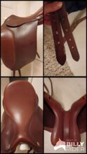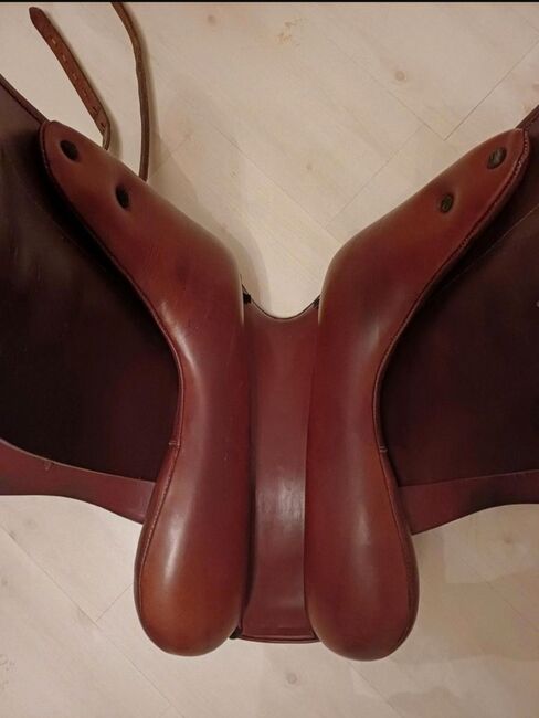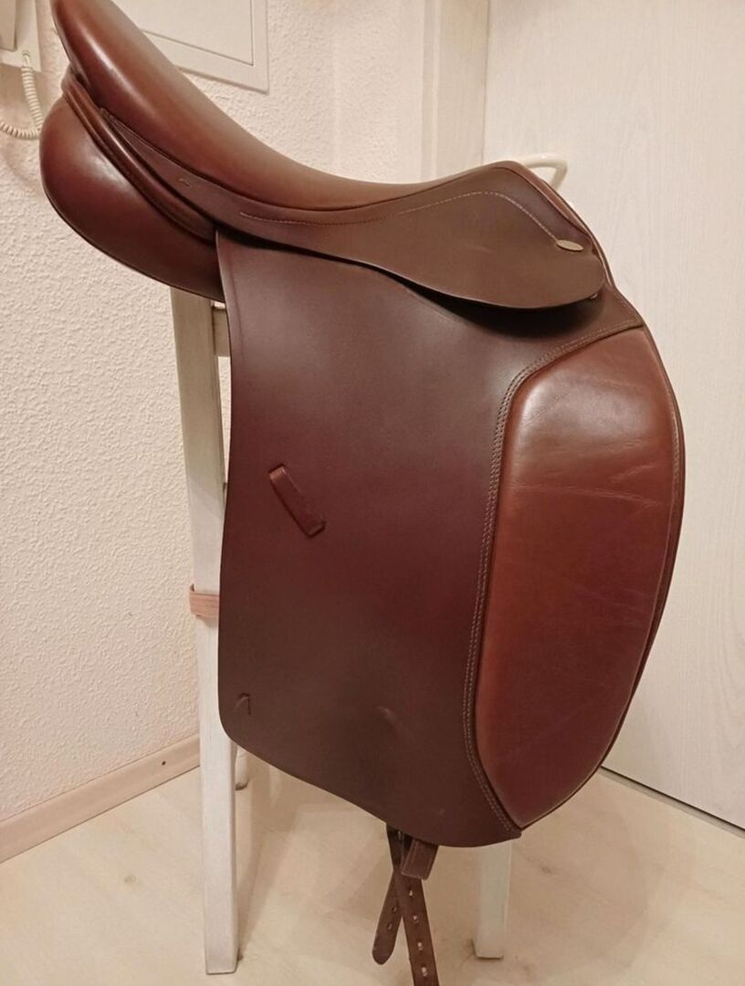 Dressuurzadel Kentaur Iceland 2 - Super chique en comfortabel dressuurzadel van Kentaur te koop. Model Iceland 2, speciaal voor brede korte paardenruggen. 17,5" in de kleur Tobacco. Vers opgevuld door de zadelmaker in de zomer van 2025 en over het algemeen in zeer goede staat, op een iets rafelig singelbandje na (zie laatste foto). Vlakke zit met langere zadelklep en kamerbreedte 5 (verstelbaar). Afmetingen op aanvraag. Verzending mogelijk