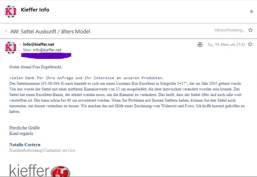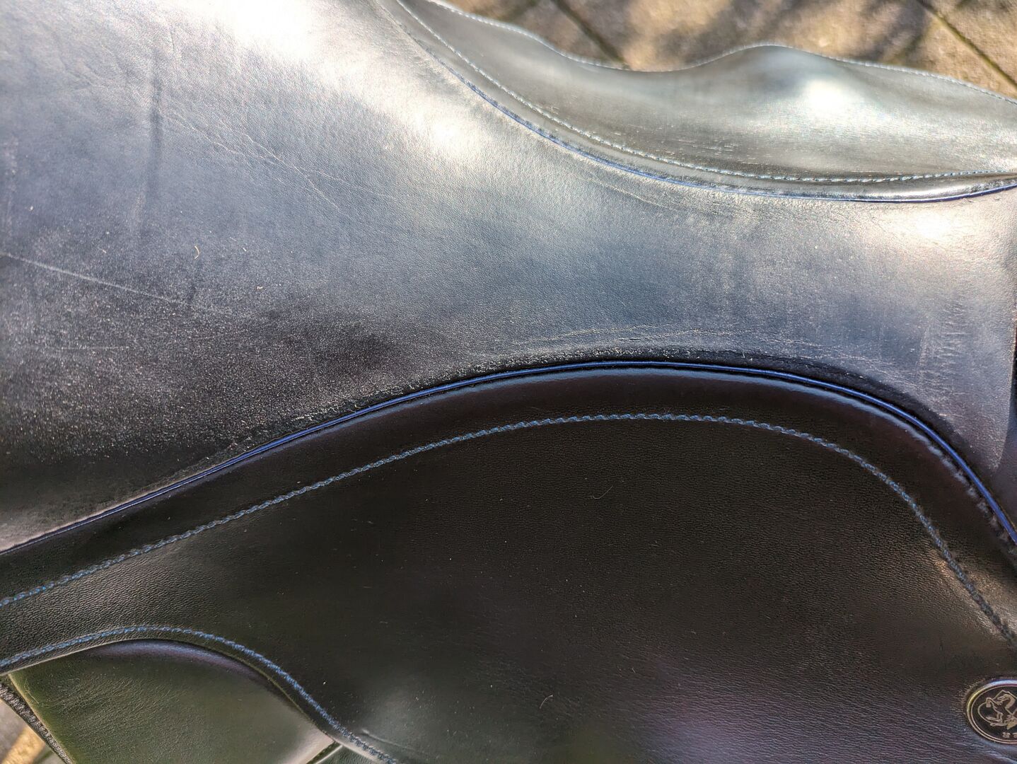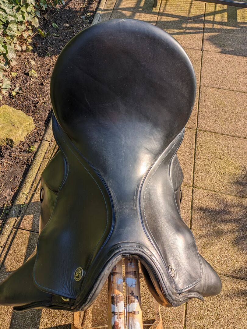 Dressuurzadel Kieffer Lusitano Freestyle Excellent 17 inch - Ik verkoop mijn goed onderhouden dressuurzadel van Kieffer, model Lusitano Kür Excellent met blauwe sierstiksels. De zitmaat is 17 Het zadel is erg comfortabel en zit heerlijk. Ik vond dit een heel fijn zadel, maar helaas past het niet meer op mijn paard. Het lag op een rond paard met een korte rug. Het zadel heeft een Excellent boom die verwarmd moet worden om de kamer te veranderen. Dit betekent dat het zadel vaker en ook heel ver versteld kan worden. Het kan tot 40 cm verlengd worden. Het is altijd droog en beschermd bewaard. Het heeft normale gebruikssporen, zoals op de foto's te zien is. Het is dit jaar voor het laatst nagekeken door de zadelmaker. De vulling is zacht en de singelstoten zijn in zeer goede staat. Ik ben de 2e eigenaar en heb hem zelf 3 jaar geleden van een dealer gekocht. De zadelbreedte is niet veranderd en is bevestigd door mijn vertrouwde zadelmaker.