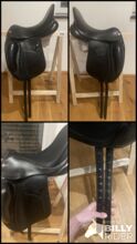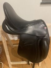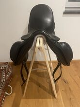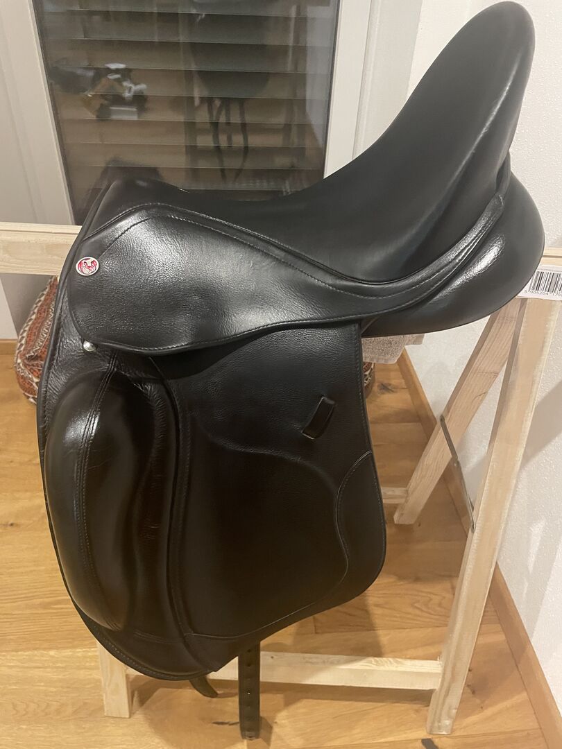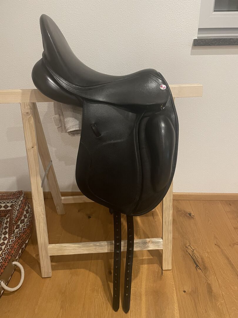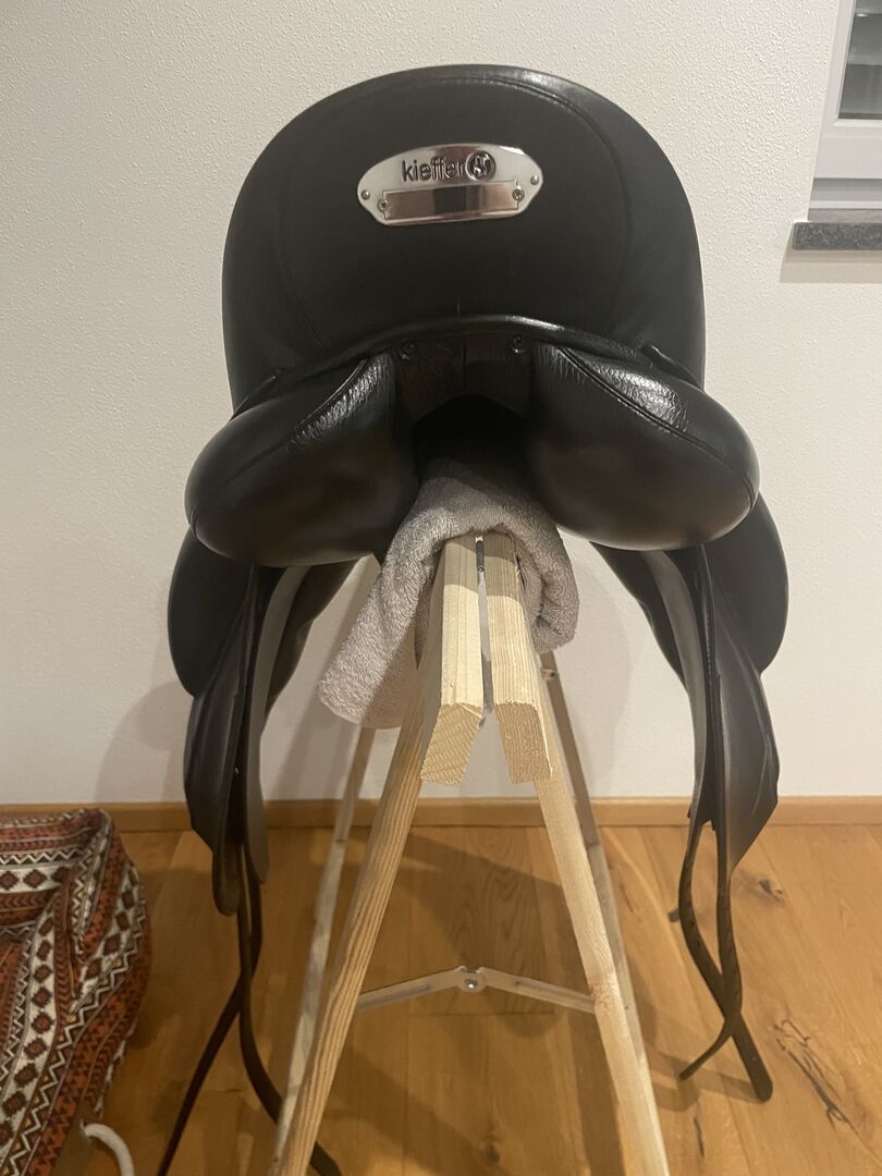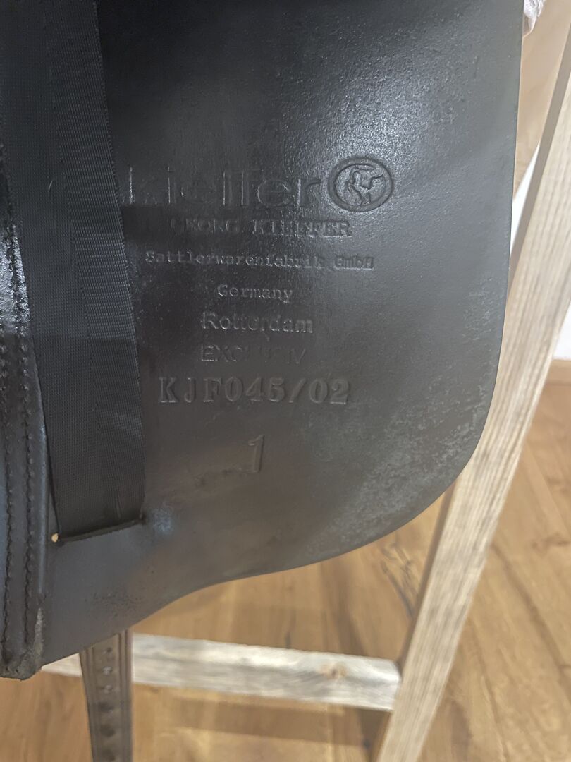 Dressuurzadel Kieffer Rotterdam - Zo goed als nieuw! Traploos verstelbare zadelboom 1000 Exclusief met slokdarmplaatje Gedubbelde, fijn gevoerde zadelkleppen met verstevigde onderrand Grote, bijzonder zachte flap op de zadelklep Diepe zit Lange singelstoten Beweegbare V-beugel Wigpaneel gevuld met gewatteerde wol Dubbel rundleer, zwart