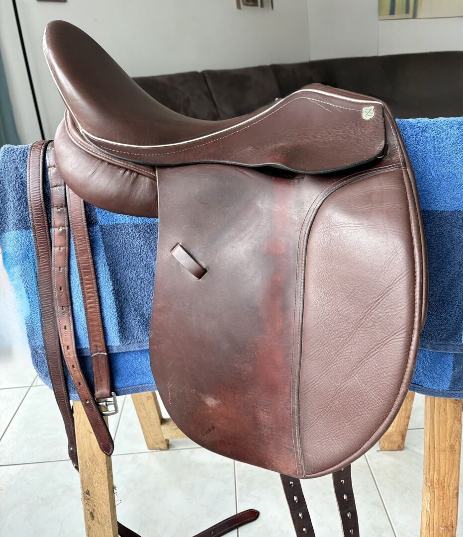 - Stijgbeugelriemen in bijpassende kleur zijn inbegrepen (met duidelijke tekenen van slijtage, maar volledig functioneel).