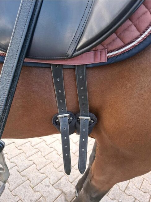 Dressuurzadel - Orthopedisch zadel - Diepe zitting Zwart gedubbeld leer Riemen met klittenband Lange singelstoten Grote Franse zadelpanelen met trapeziusspierontlasting Vulling met natuurlijke vezels Koud verstelbare kamerbreedte Veel ruimte voor de schouder door verzonken slokdarmplaat Gemaakt in Duitsland Productiejaar 2016 Zittingmaat 18,5 inch huidige kamerbreedte ca. 32