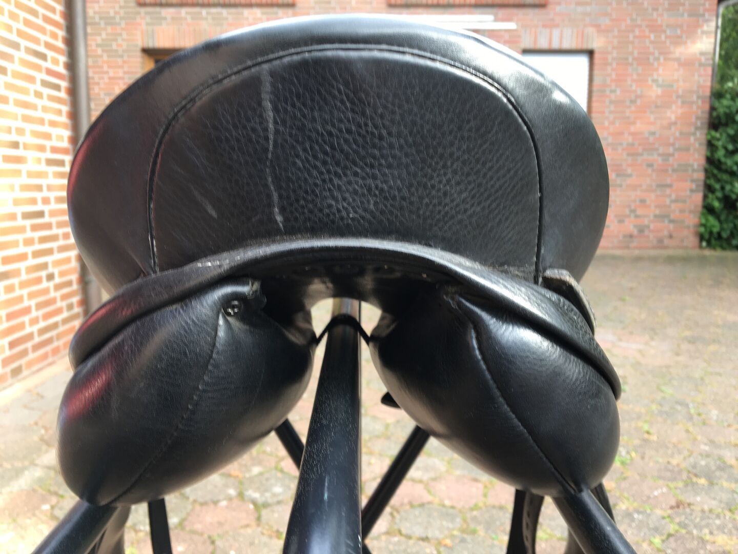 Dressuurzadel Paramount 17,5" mono flap - Gebruikt monoblate dressuurzadel in zeer goede staat van de Canadese zadelmakerij Paramount (paramountsaddlery.ca). Kamerbreedte traploos instelbaar. Met wol gevulde panelen. Verzending mogelijk tegen betaling