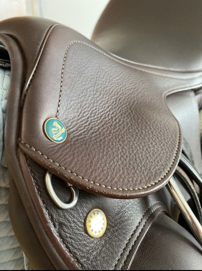 Dressuurzadel Prestige bruin - Ik verkoop mijn nieuwe Prestige dressuurzadel "Top Dressage" 18/33+2, verdubbeld, in de kleur tabacco. Met klittenband panelen.