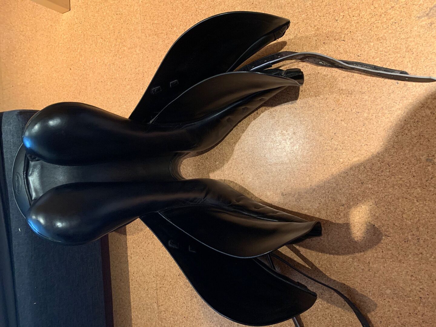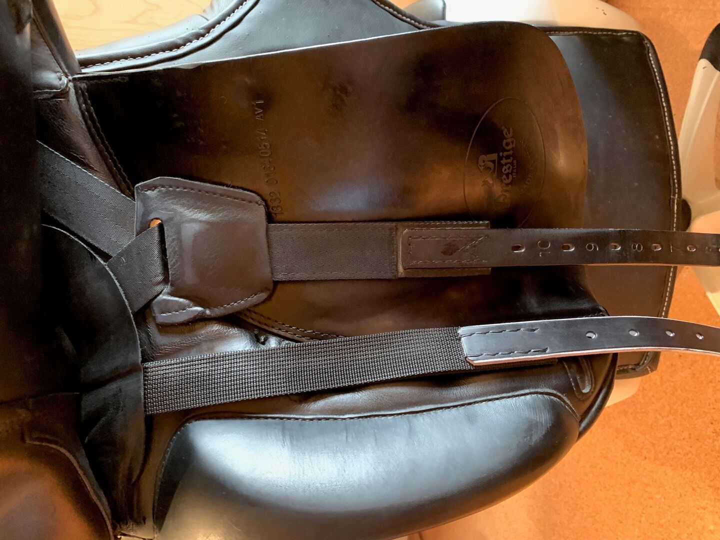 Dressuurzadel Prestige "Modena" 18 Zit 32 Gullet breedte - Ik verkoop mijn zeer weinig gebruikte Prestige dressuurzadel. Het heeft de gebruikelijke kleine tekenen van gebruik, maar geen scheuren of gaten.