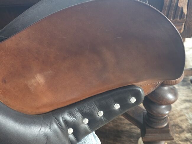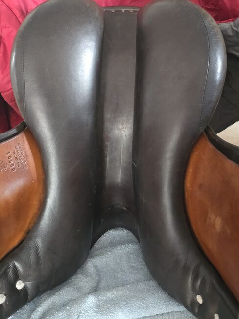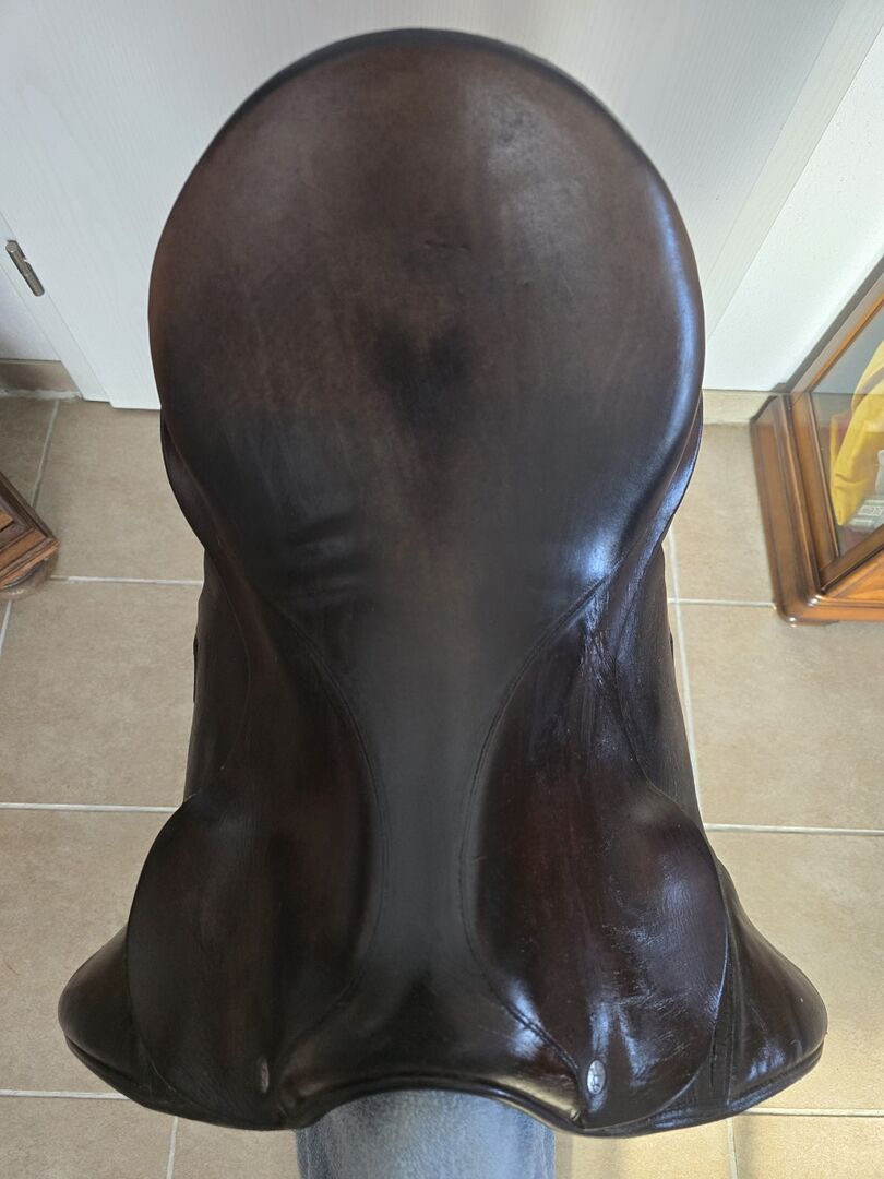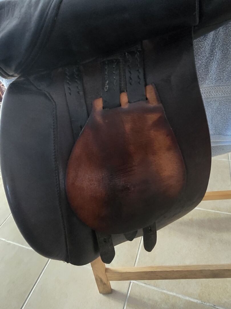 Het zadel is gebruikt voor een Lusitano. De maat staat er niet op, maar ik had altijd tussen de 17 en 17,5. Verder geen accessoires, behalve de beschermhoes.