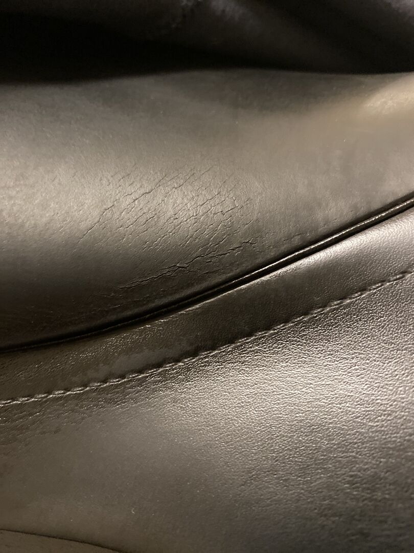 Het zadel is van 2013, ik heb het in 2015 tweedehands gekocht en er sindsdien altijd naar omgekeken. Het heeft normale gebruikssporen en kleine oppervlakkige scheurtjes aan de rechterkant van de zitting. (Zie foto) Deze zijn regelmatig door de zadelmaker gecontroleerd, maar zijn niet gegroeid of opengegaan.