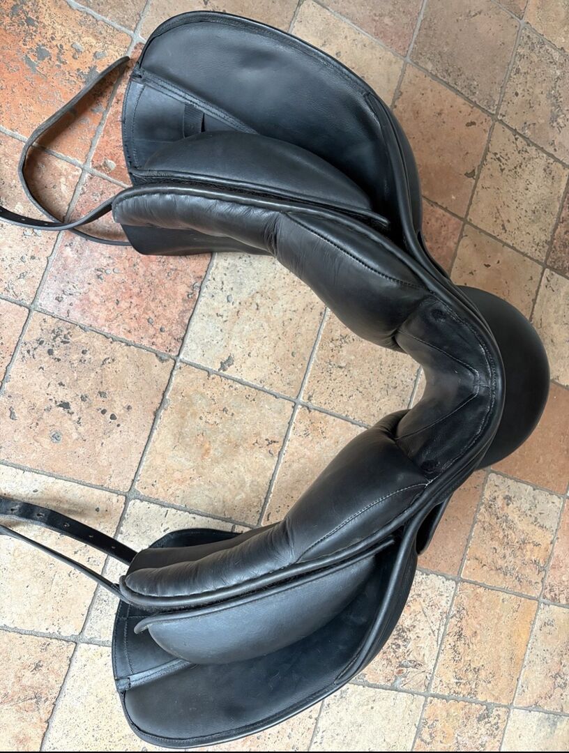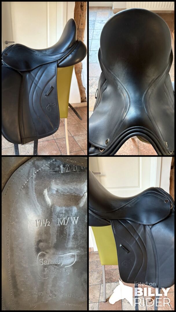 Dressuurzadel Sankey van AJ, 17,5 inch - Ik verkoop een dressuurzadel van het merk Sankey by Anke Just. 17 1/2 inch en kamerbreedte M/W. Het zadel is altijd goed verzorgd en ingevet geweest en opgeborgen met een zadeldekje, dat wordt meegeleverd. Zoals je op de foto kunt zien, vertoont het zitvlak gebruikssporen.