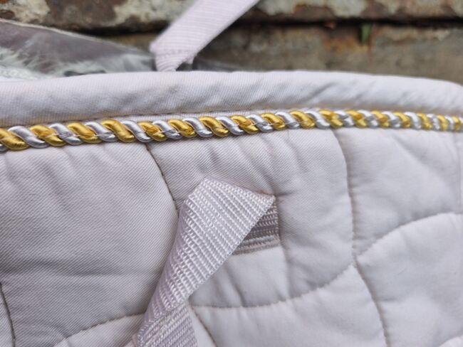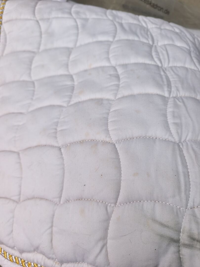 Dressuurzadeldek van USG - Mooi showzadeldek DL van USG, wit met gouden koord en gouden kroon aan de linkerkant. Heeft helaas een paar vlekken van een rode zandbak, zie foto 2 en van het zadel. Geen slijtage
