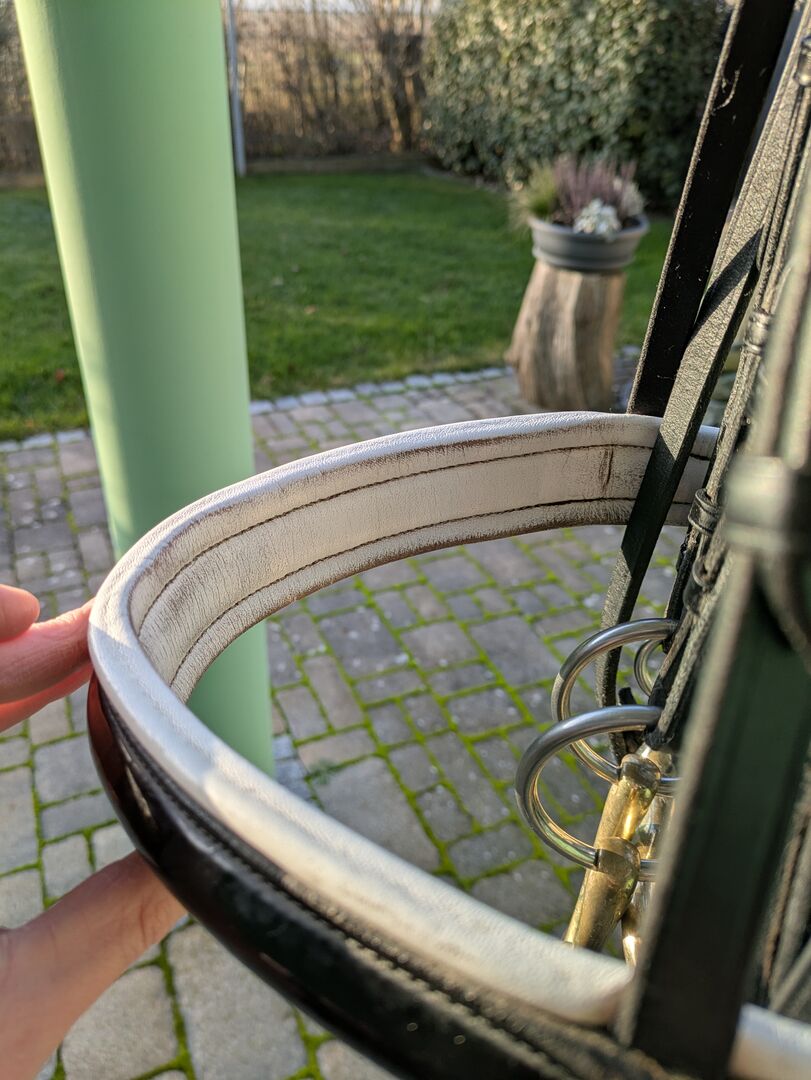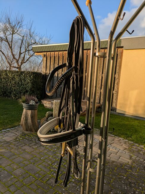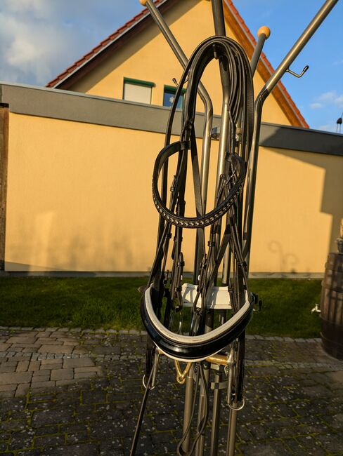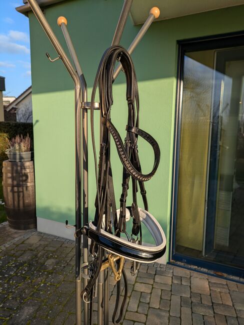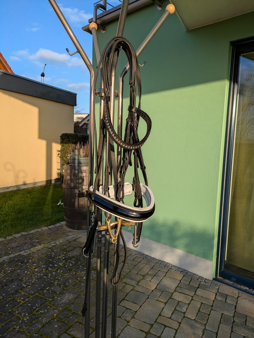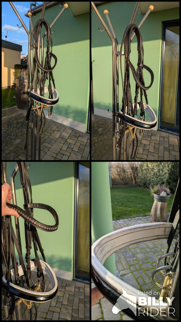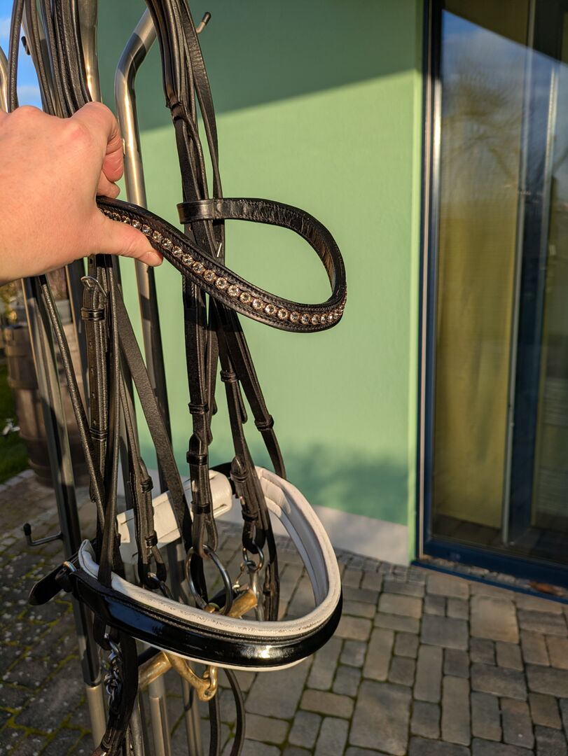 Dubbel hoofdstel van Kiefer met bitten - Te koop een curb bit met bitten van Kiefer. Gebogen frontriem met rookgrijze Swarovski-steentjes en zwarte lakneusriem. HS Sprenger dubbel hoofdstel 14cm. Snaffelbit van HS Sprenger 14cm.