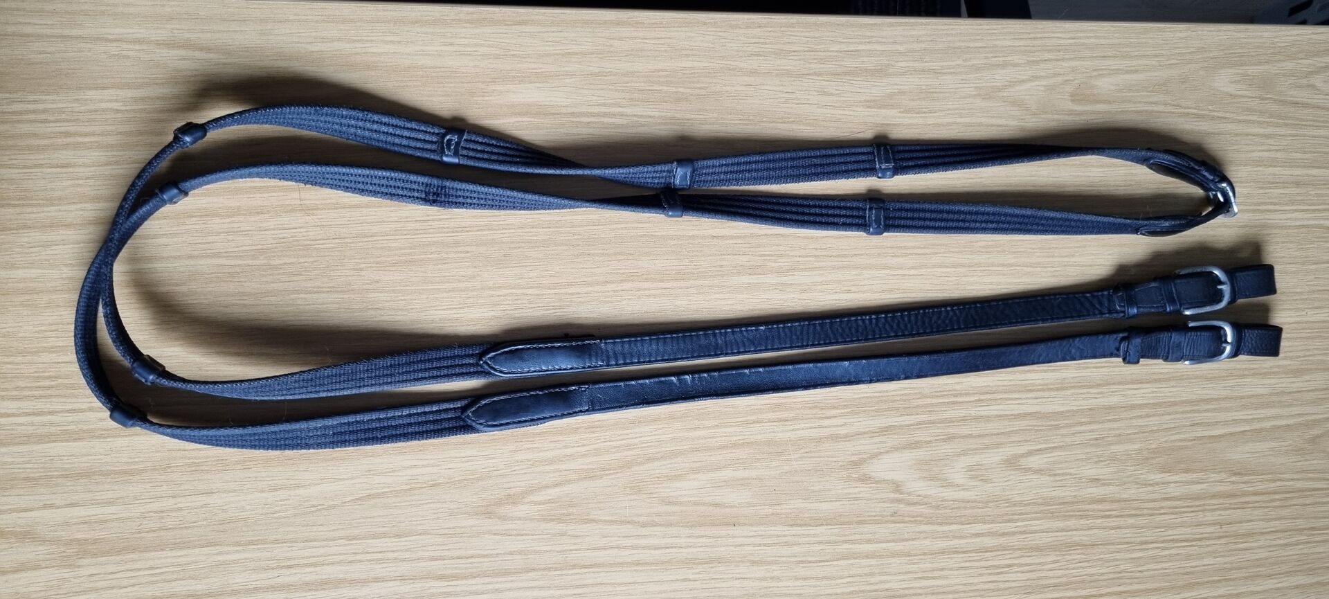 Dubbel hoofdstel warmbloed - Weinig gebruikt dubbel hoofdstel in zeer goede staat van soepel kwaliteitsleer! Het hoofdstel heeft een licht gevoerd kopstuk en een zacht gevoerde neusriem met Engelse gesp. Alle metalen onderdelen zijn niet verroest of geoxideerd! Bijpassend dubbel hoofdstel en snaffle teugels (dezelfde gespen) zijn inbegrepen. De knevelteugel is ook elders gebruikt en wijkt daarom af van de staat van de andere onderdelen (zie foto's).